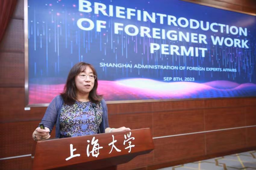 上海市出入境管理局警官王韬向外籍教师详细介绍了我国出入境签证和外国人在华停留相关管理政策,重点强调了来华工作居留许可、境外人员住宿登记、行为规范、永久居留等。
