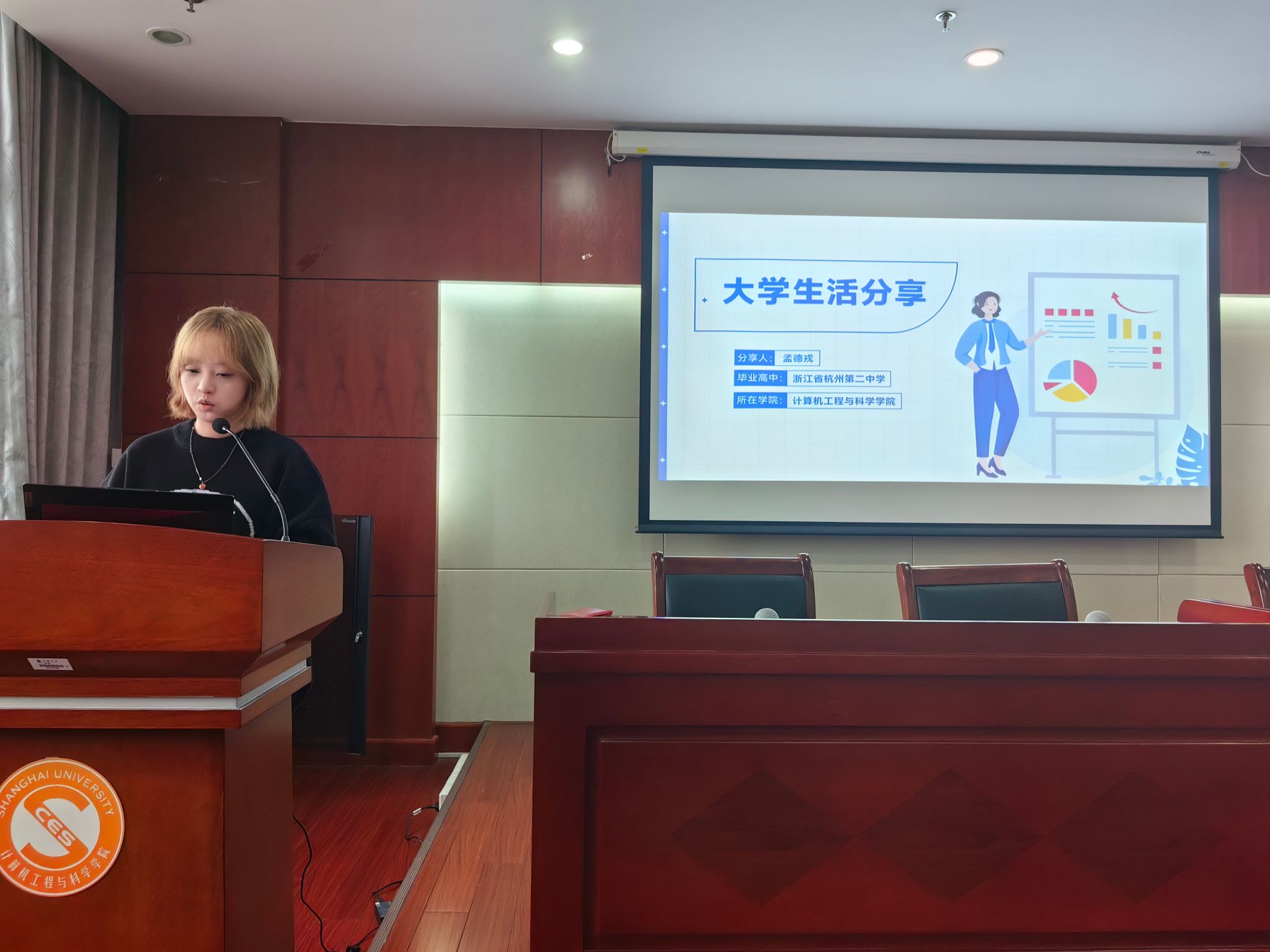 来自杭州第二中学、现就读于计算机学院计算机科学与技术专业的孟德戎同学作了经验分享。她提到,在学生工作中要多结交朋友,锻炼团队交往能力、锻炼思维能力,学会新的技能;在学业发展时尽早确定自己努力的方向并且准备。
