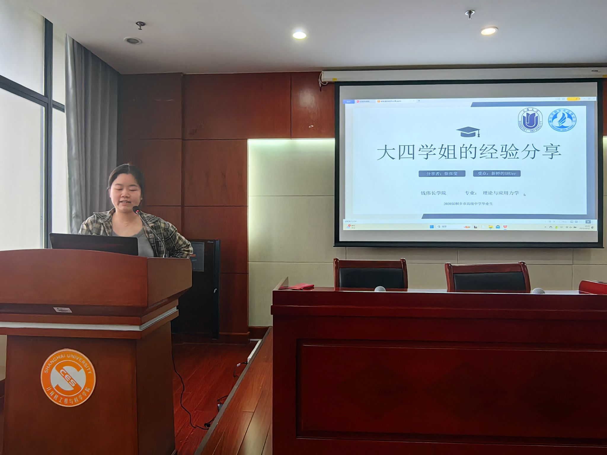 来自桐乡市高级中学、现就读于钱伟长学院理论与应用力学专业的徐张莹同学从个人经历、课外活动、注意事项三个角度分享自己的大学生活和感悟,她指出有效利用假期、提早做好规划、打破信息闭塞是达成目标的关键。
