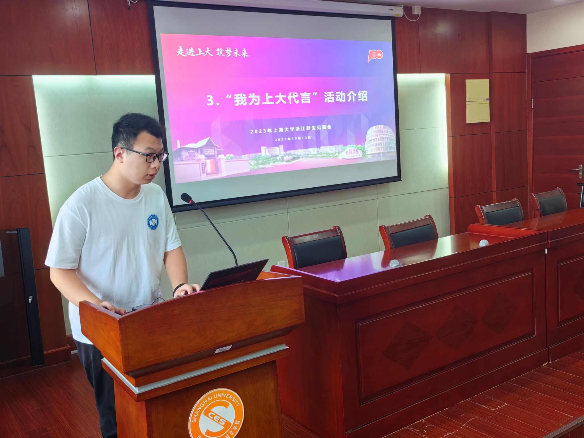 上一年度“我为上大代言”活动大队长袁澍楠同学详细介绍了往期活动的开展情况及活动内容,并鼓励同学们积极参与到活动中。活动优秀团队获得者、来自青田中学的王鸣宇同学结合参与“我为上大代言”宣讲实践活动的经历,针对活动准备、策划、落实及思考等环节作了全面详细的介绍,使同学们对此活动的实践过程有了更加详细的了解。