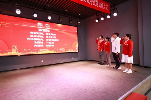 仪式上,全体同学高举右拳,共同发出青春宣言:“为进博,一起来!向前进,博青春!” 庄严的宣誓,表达了志愿者们服务国家、奉献进博的信心和决心。