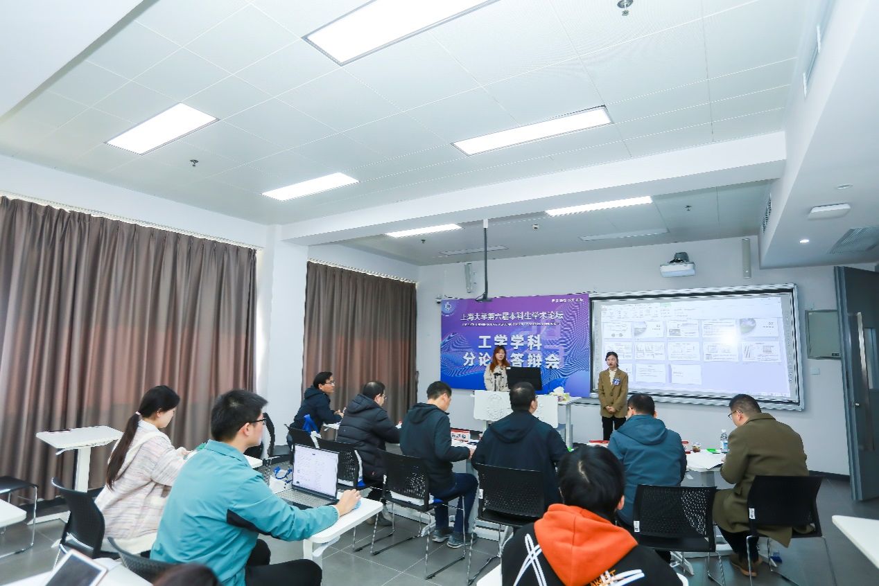 工学学科分论坛的评委由材料科学与工程学院石晓超教授,通信与信息工程学院文建湘教授,环境与化学工程学院相明辉研究员,无人艇工程研究院副院长岳涛副教授,微电子学院李俊副教授,通信与信息工程学院孙彦赞副教授,计算机工程与科学学院刘炜副研究员组成。来自日新书院、伟长书院、宏嘉书院、溯微书院、自强书院、丝路书院的25位同学进行了答辩,论文覆盖了包括化工和环境科学、材料学、电子信息、通信工程、计算机科学、机械工程在内的多个学科和研究方向。