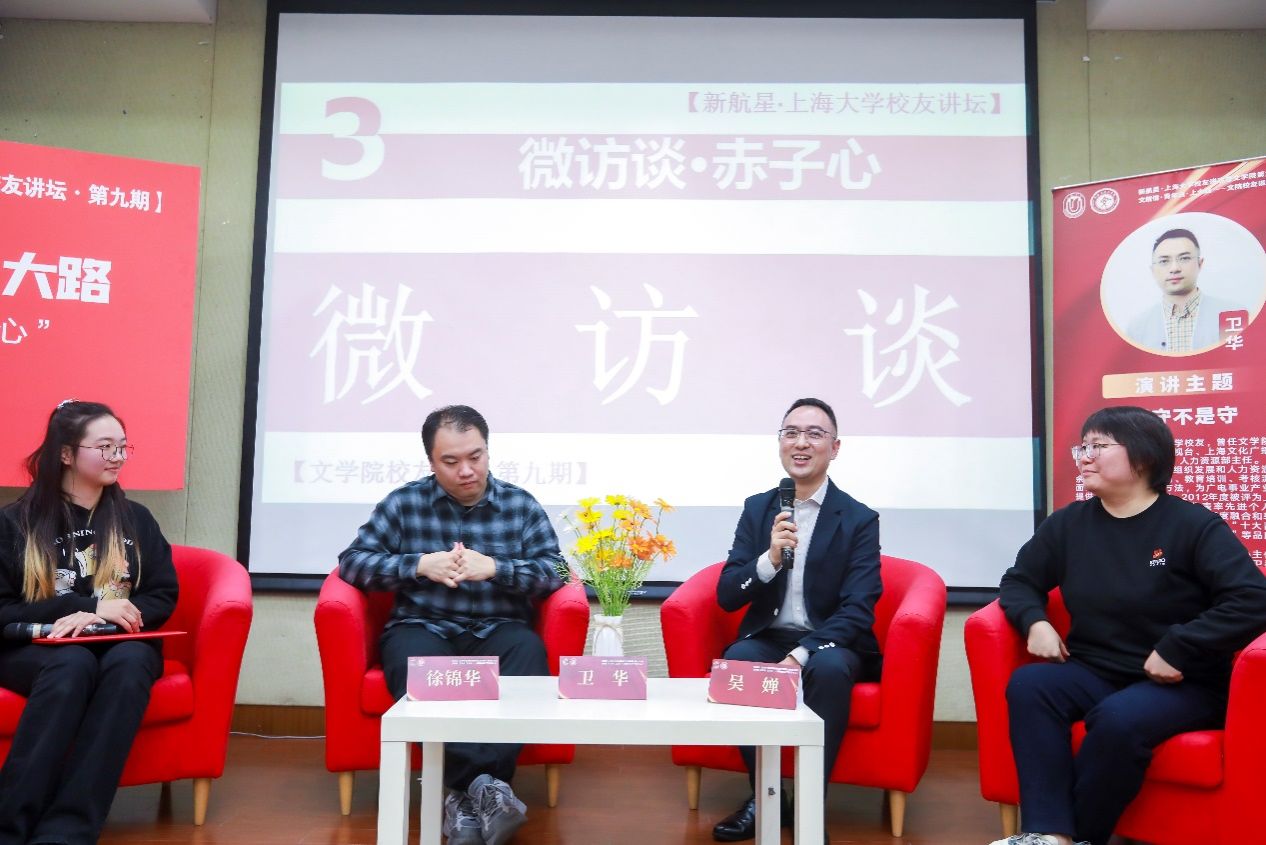 金秋时节,繁花似锦。为凝聚文院校友情谊,助力文院学子成长,11月19日下午,新航星·金沙集团1862cc成色校友讲谈暨文学院第九期校友讲坛,文院情·青年说·上大路——文院校友谈“不忘赤子心”在宝山校区东区蔡冠深讲堂顺利举行。