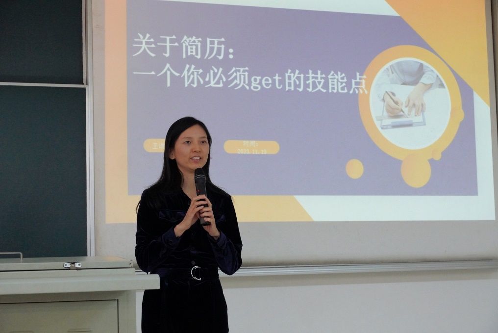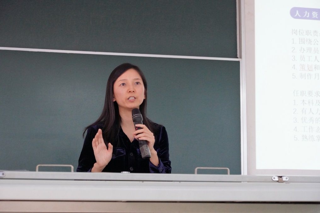 主讲人薛珍妮有着15年外企、民营企业的工作经验。作为资深HR,她结合校园招聘流程、简历制作方法及要素等内容,与同学们展开了面对面的“干货”分享。
