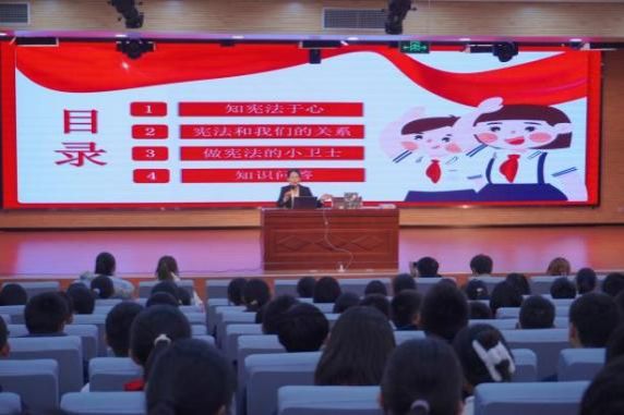 在问答环节中,同学们不但十分踊跃积极回答问题,而且每一道题目都能回答准确,尤其是在谈对宪法的认识和如何在日常生活中践行宪法的问题时,有的同学谈到践行宪法要从小事做起,在学习生活中首先要遵守学校手册,从小事上践行宪法精神;