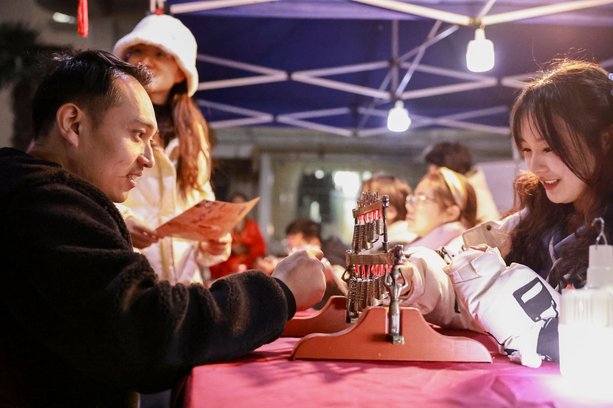 白鹿洞书院展区以“射”为关键词,策划出“成语填词投壶”小游戏,将传统射艺与文字艺术巧妙融合,让同学们在竞技之中领略“君子六艺”。