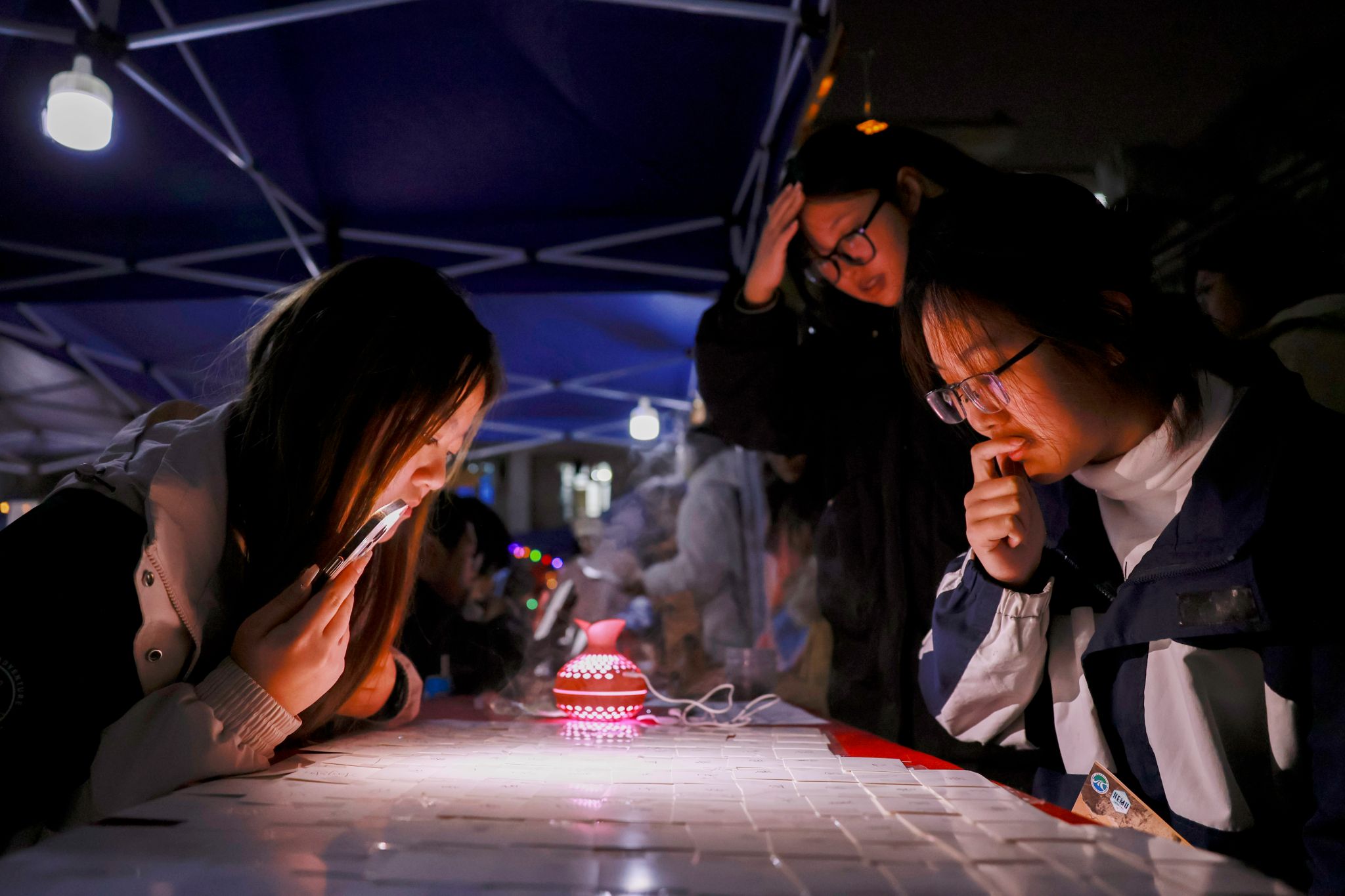 应天书院展区布置了诗词与数学的精妙机关,让同学们在“飞花令”和数字矩阵中,体会古人饮酒行令的雅致,探索古代数学与天文历法的奥秘。