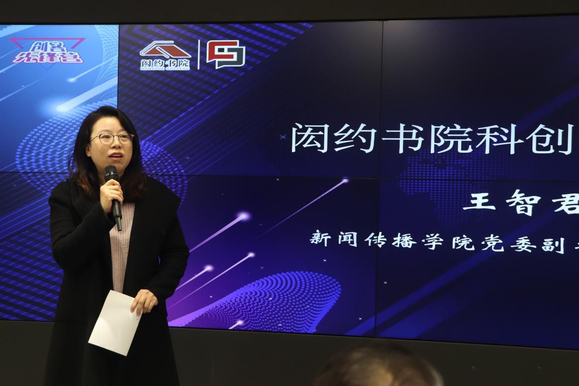 接着,闳约书院副院长、新闻传播学院党委副书记、副院长王智君对闳约书院的科创基本情况进行了介绍,列举了近3年书院学生参加各项创新创业类赛事的优异成绩,同时要搭建不同学科交叉的平台,充分发挥各个学科特色,打通合作的路径,在不同学科融合与互补的过程中迸发出创意的火花,让每一个学生的创新想法在创客先锋营中得到培育和助力。