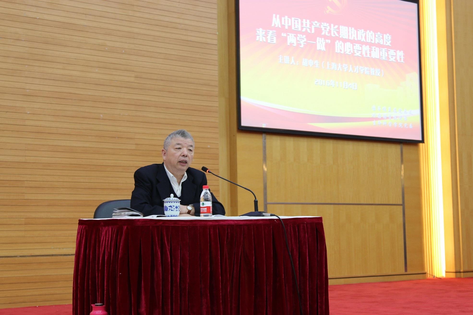 胡申生教授首先围绕党的十八届六中全会全面从严治党主题,对会议审议通过的《关于新形势下党内政治生活的若干准则》和《中国共产党党内监督条例》等进行了深入阐释,认为本次全会为加强和规范党内政治生活、加强党内监督,全面从严治党、深入推进党的建设新的伟大工程提供了行动指南。随后,他从十八大以来我党相继开展的“群众路线”、“三严三实”专题教育出发,认为中央组织“两学一做”专题学习,对深化新形势下中国共产党领导下的多党合作、政治协商制度、民族区域自治制度、基层民众自治制度等基本政治政治制度具有重要意义,有利于推进中国共产党长期执政的合法性。最后,他从党的革命历史、建设历史以及现实发展等方面系统分析“两学一做”学习的历史意义与现实价值,认为“两学一做”主题学习作为新形势下党的建设重要内容,既是继承我党优良革命传统的历史要求,也是新形势下党的执政能力建设的现实需求,更是实现中华民族伟大复兴中国梦的必由之路。