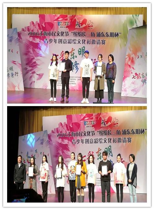 11月5日,2016年上海市民文化节“缤纷长三角浦东东明杯”长三角地区青少年创意彩绘文化衫颁奖仪式在浦东新区东明路街道社区文化中心隆重举行。我校参赛同学美术学院于奇赫同学荣获金奖,数码艺术学院汪宇同学和美术学院翁晨露同学获得银奖。