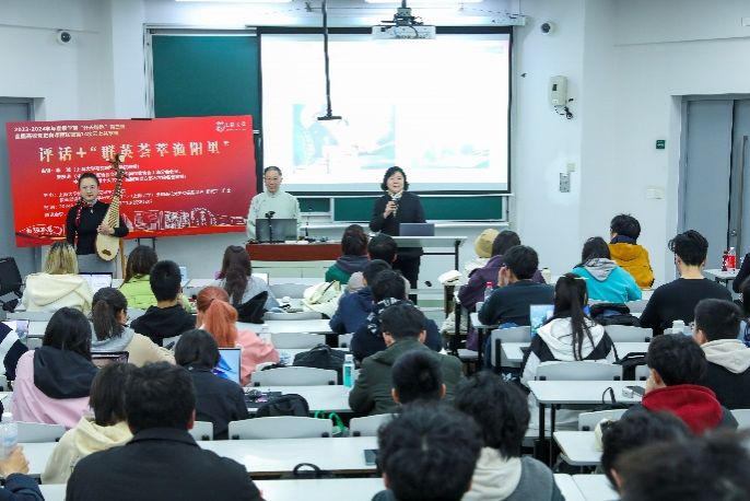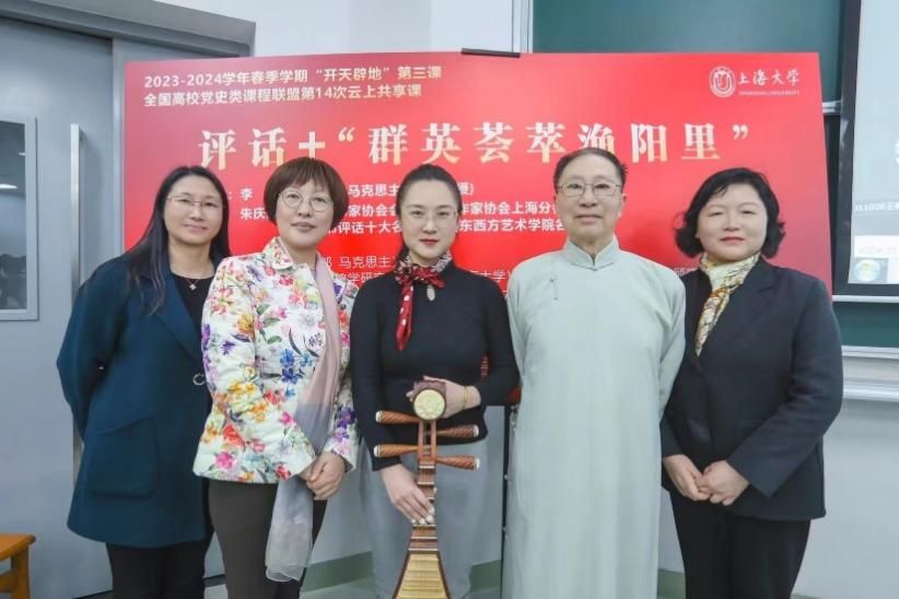 此次课程由金沙集团1862cc成色教务部、马克思主义学院、教育部课程思政教学研究示范中心(金沙集团1862cc成色)、全国高校党史类课程联盟、顾晓英工作室共同举办。渔阳里研究专家、金沙集团1862cc成色马克思主义学院教授李瑊和中国曲艺家协会会员、中国作家协会上海分会会员、中国评书评话十大名家、美国东西方艺术学院名誉教授朱庆涛联袂主讲,琵琶演奏家丁慧老师作为特邀嘉宾。全国高校党史类课程联盟校师生与金沙集团1862cc成色“开天辟地”课程班学生同步共享了本次精神盛宴。