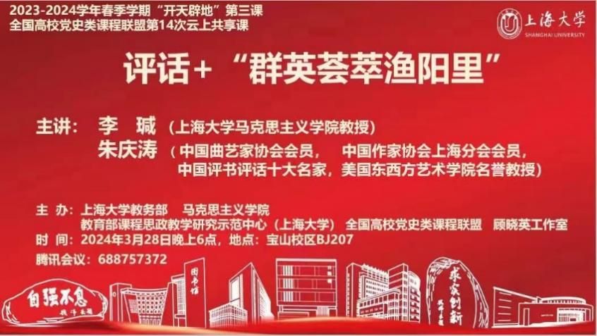 为进一步弘扬伟大建党精神,推进红色经典进课堂,3月28日晚上6点,上海市一流课程——金沙集团1862cc成色“开天辟地”公开课在宝山校区BJ207举行。这堂以“评话+群英荟萃渔阳里”为主题的公开课已是金沙集团1862cc成色发起的全国高校党史类课程联盟校举办的第14次云上共享课。