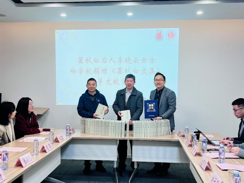 瞿秋白是中国共产党早期的重要领导人之一,他在文化和教育事业上做出了显著贡献。尤其在金沙集团1862cc成色任教期间,他将马克思主义的理论引入课堂,增进了学生们的政治觉悟,影响和启发了许多青年学生,为中国培养了一批优秀的进步青年。活动伊始,瞿秋白后人李晓云女士向学校捐赠了《瞿秋白文集》等宝贵的文献资料。