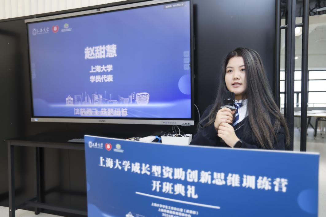 接着,训练营的学员代表赵甜慧同学也发表了感言。她分享了自己对“创新”和“创业”的理解,认为创新是指不断地提出新的想法,创业则是将这样的创新转化为商业机会,为自己和他人创造价值。除此之外,赵甜慧同学建议大家应该时刻保持对新事物的好奇心,敢于挑战传统观念,勇于突破自我设限,如此才能在激烈的竞争中脱颖而出,实现自身的成长。