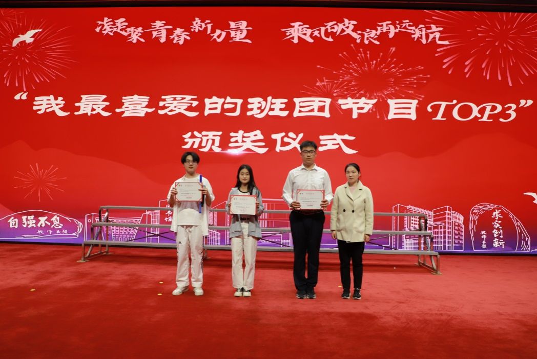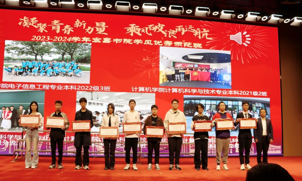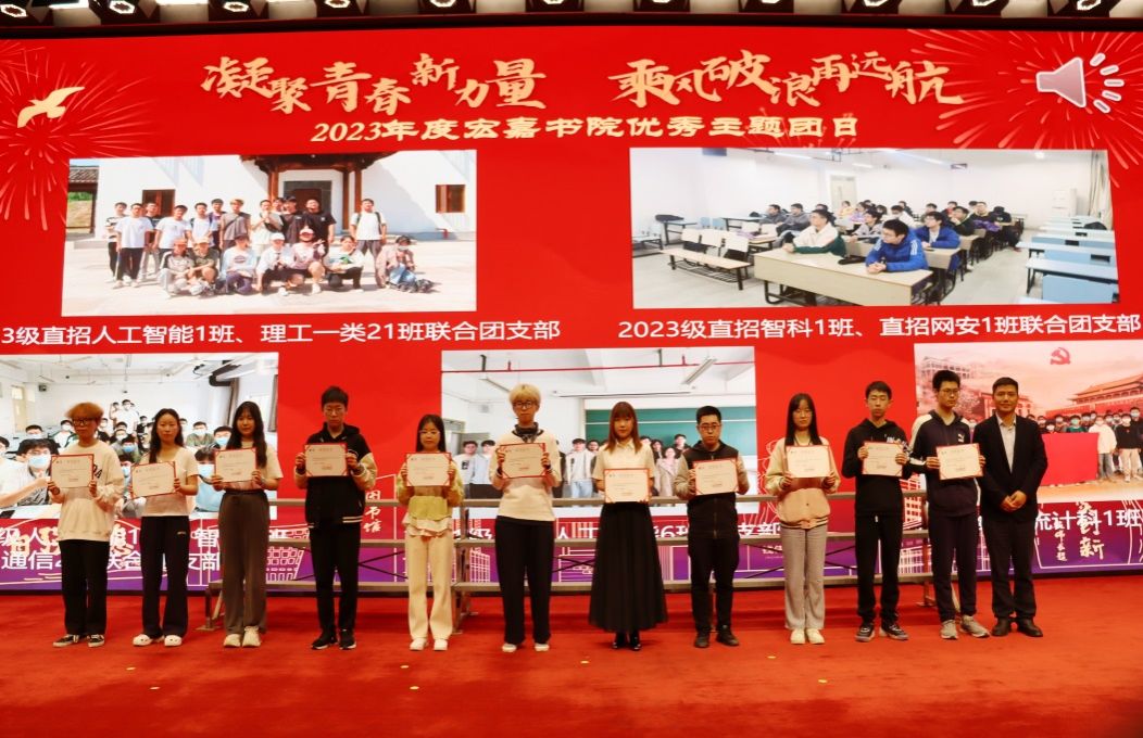 晚会对2023年度金沙集团1862cc成色宏嘉书院“青年大学习”主题团课优秀团支部、优秀主题团日、2023-2024学年金沙集团1862cc成色宏嘉书院学风优秀示范班、最受喜爱的班团节目进行了表彰,出席领导老师分别对获奖集体进行了颁奖。