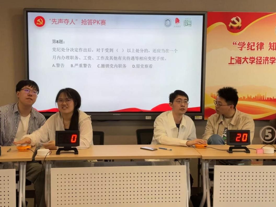 随后进入正式竞赛,由经济学院本科生第二党支部学生党员程元辉主持,知识竞答分为“单枪匹马”个人必答赛、“通力协作”团队必答赛和“先声夺人”抢答PK赛3个环节。通过前期各党支部组织开展的党纪学习教育,在座党员都将党纪知识牢记于心,各党支部纷纷迅速且准确地进行作答。每个环节激烈角逐,各党支部充分发挥知识储备,保持冷静思考和沉着应对的态度,紧密协作,默契配合,你追我赶,斗志昂扬,掀起竞答热潮,为学习注入了新的动力和活力。通过综合考察支部个人知识掌握程度及团队协作能力,结合比分决出了比赛名次。每轮比拼后,主持人均带领大家回顾学习所涉及的知识细节,加深学生党员对党纪知识的理解与掌握。