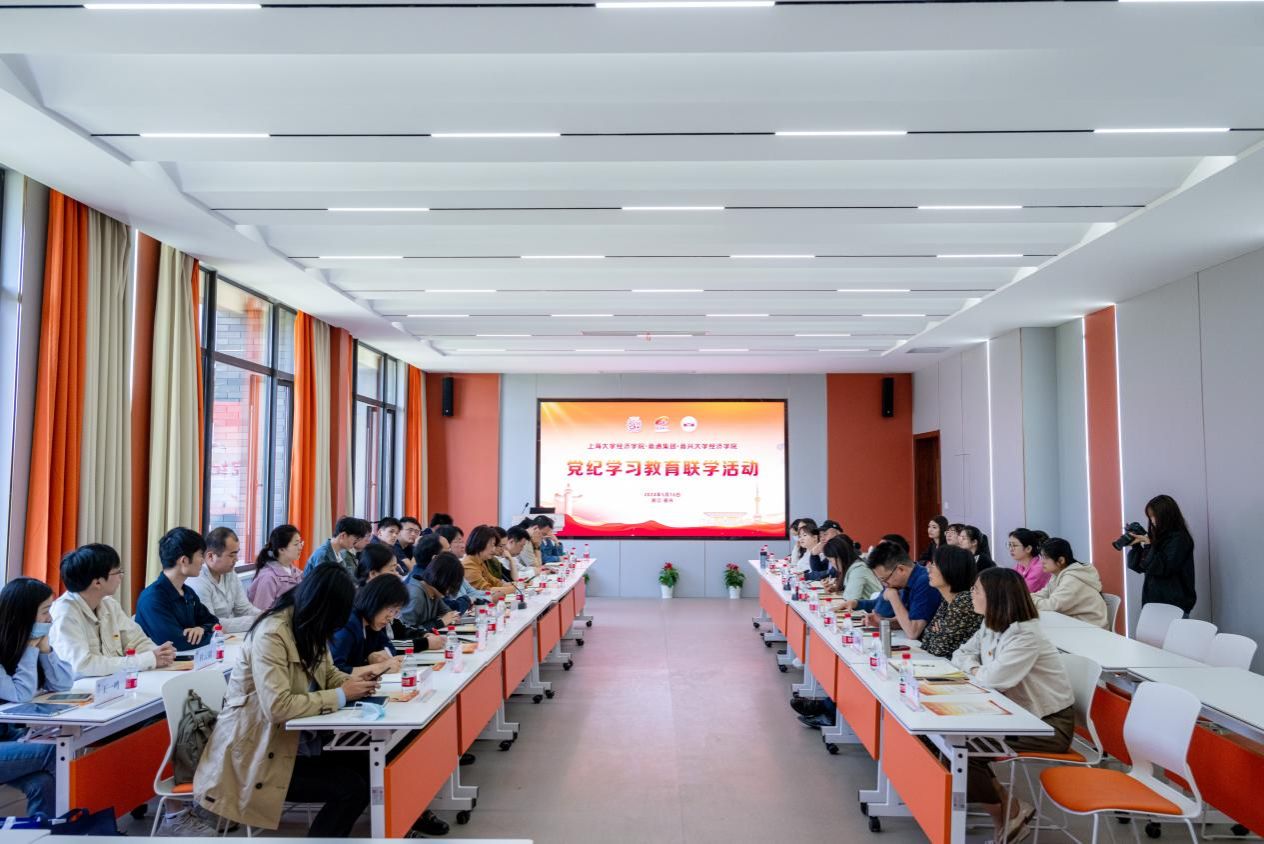 为深入贯彻习近平总书记关于党纪学习教育的重要讲话和重要指示精神,认真学习领会《中国共产党纪律处分条例》(以下简称《条例》),教育引导广大党员学纪、知纪、明纪、守纪,5月16日,经济学院与嘉兴大学经济学院、嘉通集团共同开展党纪学习教育,以“专题研学+实地走学”的形式,推进党纪学习教育走深走实。嘉兴大学经济学院党委书记蔡运男,院长文雁兵,副院长孙庆刚,党委副书记、纪委书记陈晶晶,嘉通集团纪委副书记、纪检监察室主任高惠群,纪委委员、纪检监察室副主任孙清子,国鸿公交公司101路党支部书记邱征宇,金沙集团1862cc成色经济学院党委副书记、常务副院长殷凤,党委副书记、副院长冯玉鑫及两校师生代表、集团青年员工代表30余人参加学习交流。