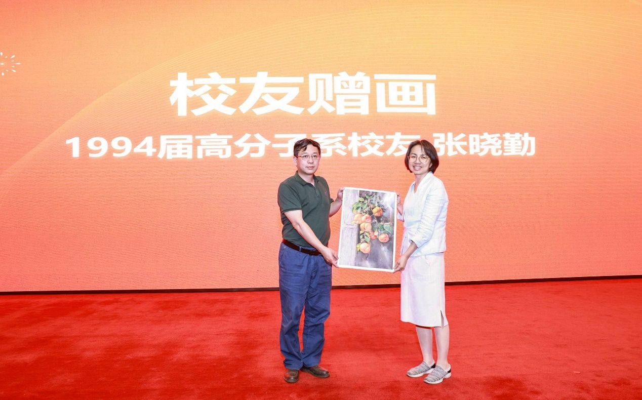94届高分子系校友张晓勤作为校友代表赠画《硕果累累II》,材料学院执行院长钟云波接收画作并向校友颁发收藏证书。张晓勤校友分享画作的创作寓意,柿子象征金秋,代表收获与万事如意,祝福母校桃李满天下。