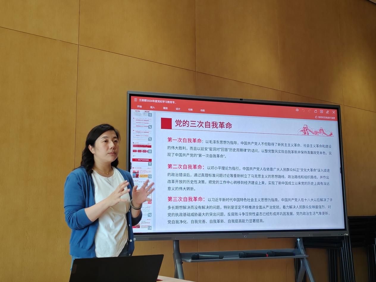为深入学习贯彻习近平总书记关于党纪学习教育的重要讲话和重要指示批示精神,扎实推进党纪学习教育,引导全体党员进一步强化纪律意识和规矩意识,始终做到以实际行动践行忠诚、干净、担当的政治品格,5月29日下午,国际部党委书记王丽娜面向全体党员,讲题为“学习《中国共产党纪律处分条例》,廉洁自律、慎独慎微,做24小时合格党员”的专题党课。