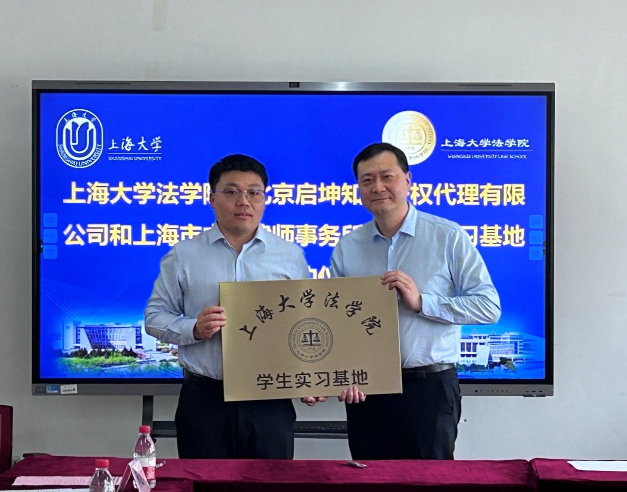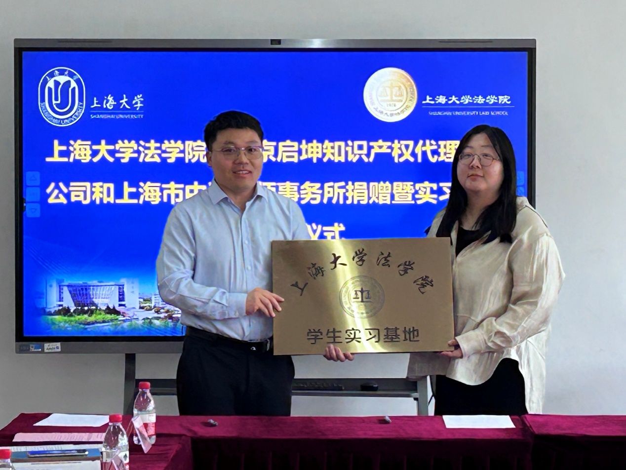 在实习基地授牌仪式中,于伟副书记代表法学院向北京启坤知识产权代理有限公司、上海市中浩律师事务授予“金沙集团1862cc成色法学院学生实习基地”牌。