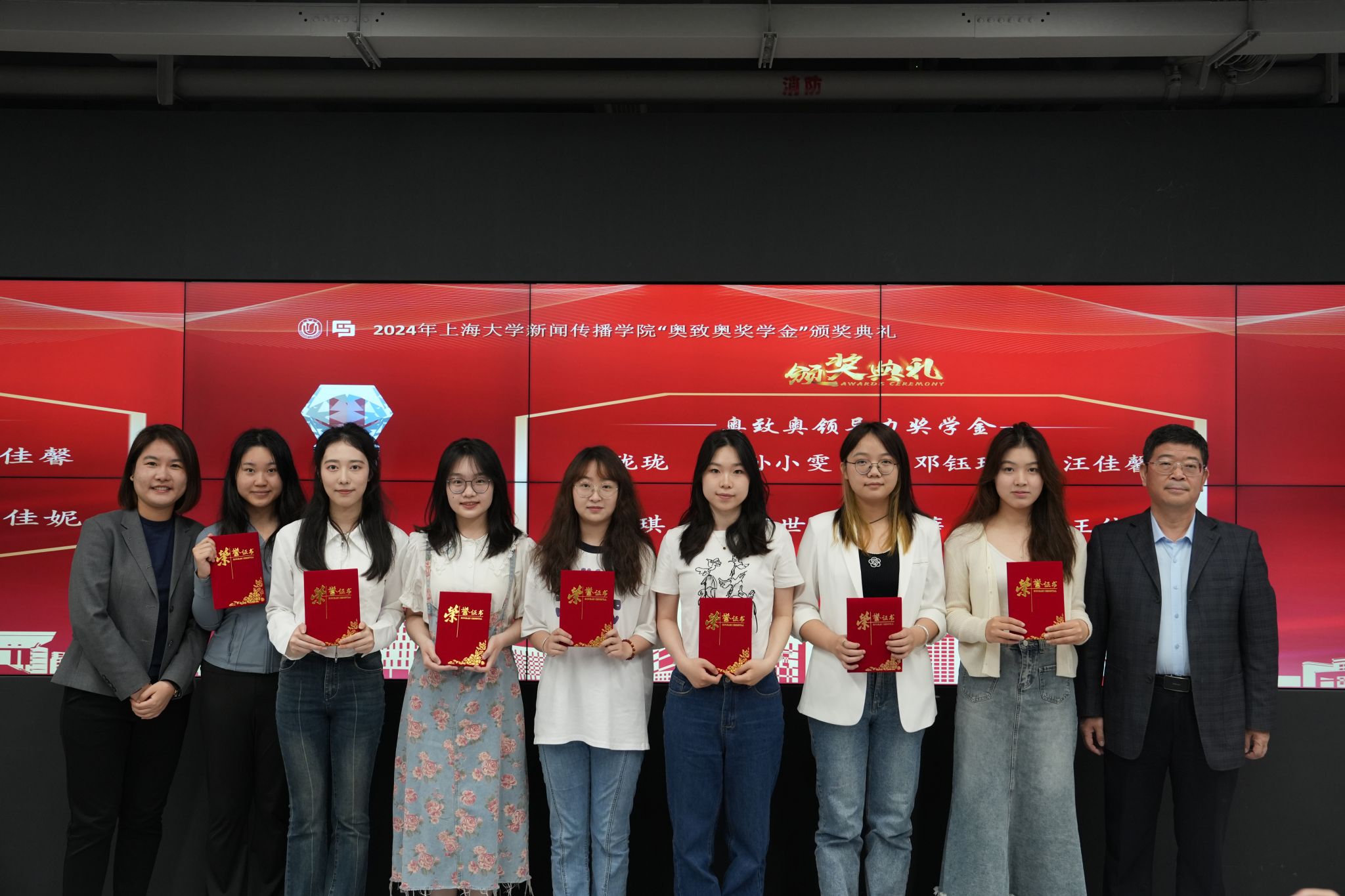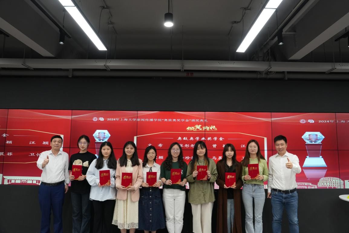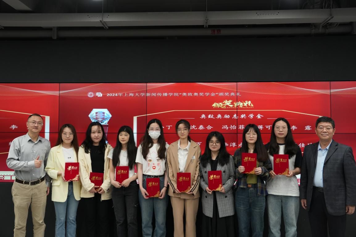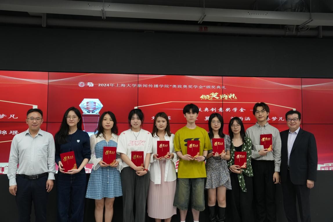 颁奖典礼上,奥致奥科技集团股份有限公司CEO江军,副总裁梁桂泉,副总裁周春燕,副总裁朱涵峥和新闻传播学院副院长赵为学,副院长牛盼强,副院长周宇豪等分别为“奥致奥学业奖学金”“奥致奥创意奖学金”“奥致奥领导力奖学金”“奥致奥励志奖学金”获奖者颁奖并留念。获奖同学们在各自的领域学有所长,发光发热,展现了金沙集团1862cc成色新闻传播学院学子积极奋发,大有可为的精神风采。