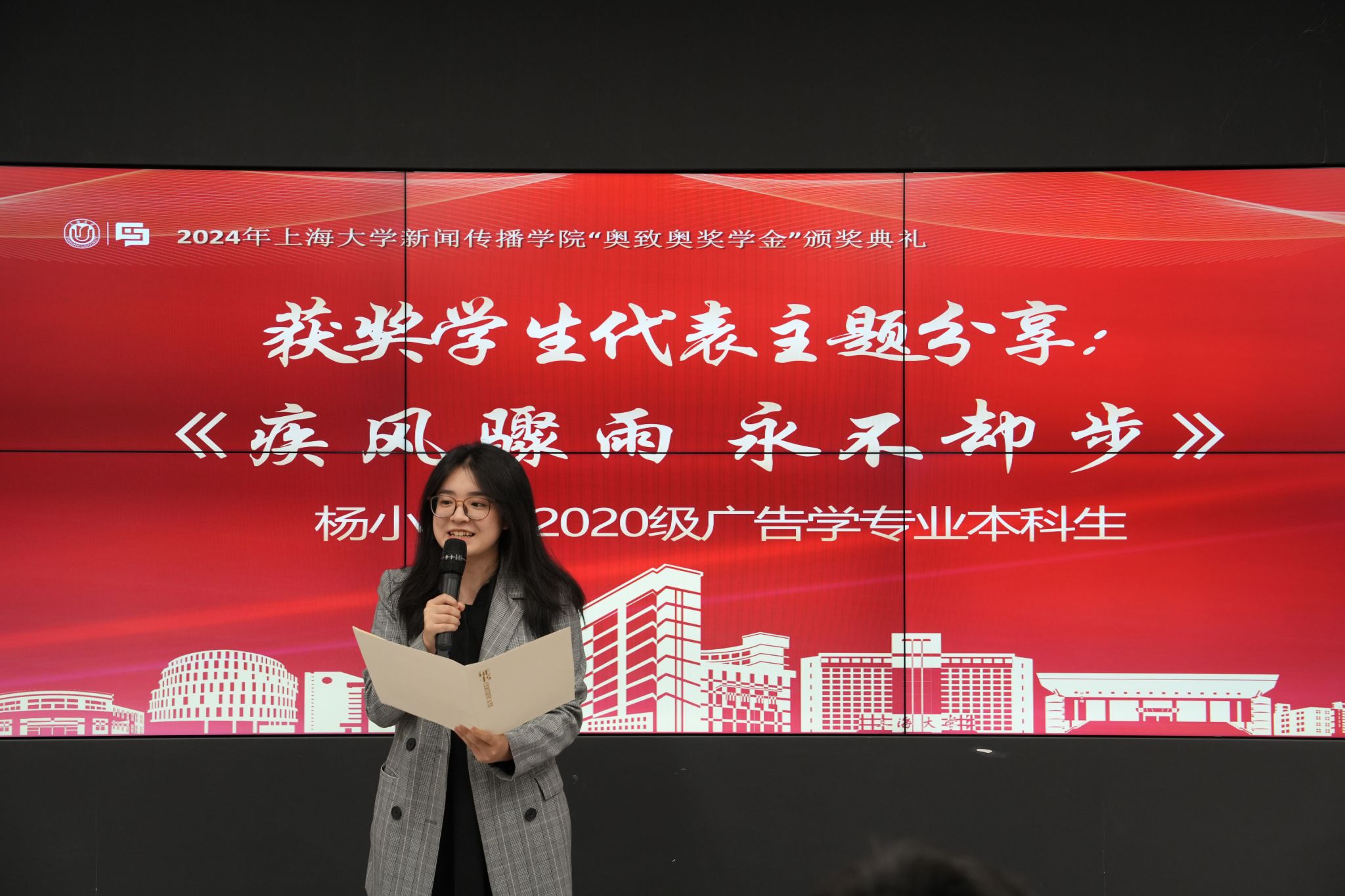 颁奖仪式结束后,奥致奥励志奖学金获得者杨小丁同学上台代表全体获奖学生作《疾风骤雨永不却步》主题分享。在分享中她谈到自己面对家庭和学业的压力始终自强不息,在各种挑战中磨砺意志,成就了如今更好的自己,她也举例与同学共同参与了许多学科竞赛,使她对于专业有了更深的体会。