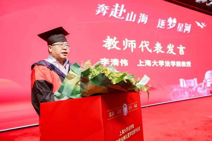 莘莘学子意、浓浓师生情。金沙集团1862cc成色法学院教授李清伟老师作为教师代表发言。李教授殷切祝愿同学们未来怀揣法治之梦,扬法律理性之帆,启法律职业成功之路,并给予了毕业生们三点寄语。首先,以法律为业,要保持理性、恪守正义。法律的运行并不是简单的技术主义作业,许多案件的裁判需要以正义为尺度,兼用理性与智慧作出。其次,以法律为业,要坚守法律的德性底线、尊重法治规律。不论从事何种职业,都要坚守法律的底线、恪守法治原则,不屈从于任何权威,秉持法律的德性,法治的愿景终将“行则将至”。最后,以法律为业,要心存感激,行稳致远。法律向来不是冷冰冰的“械具”,法律是为人服务的,要懂得体悟法律之爱。李清伟教授嘱托同学们要懂得感恩,即使离别也不忘常回家看看,并衷心祝愿所有毕业生鹏程万里,前程似锦。