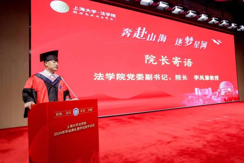 法学院院长李凤章教授对全体毕业生表示了衷心的祝贺,并寄予最殷切的嘱托。李院长坦言,这个世界充满不确定性和挑战,但理性和坚定可以让大家变得更加值得信赖。这个世界撕裂和动荡一直存在,但是在党的领导下,大家团结一致相互支持,就可以有效应对风险。所有的相遇都值得珍惜,所有的经历都是对彼此的锻造。面对即将到来的困难与挑战,要牢记“路虽远,行则将至;事虽难,做则必成”,牢记院训中的“克坚”。未来已来,希望同学们要有足够的智慧和判断力识破可能的险恶,要有足够的坚韧承受未来可能出现的困难。在发言的最后,李院长祝愿同学们扬帆出海,一路劈波斩浪、勇往直前。
