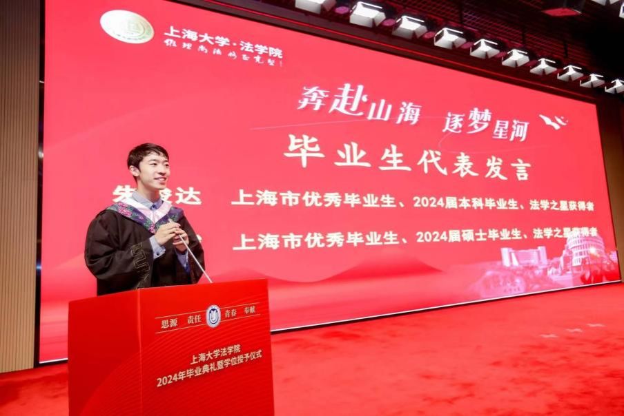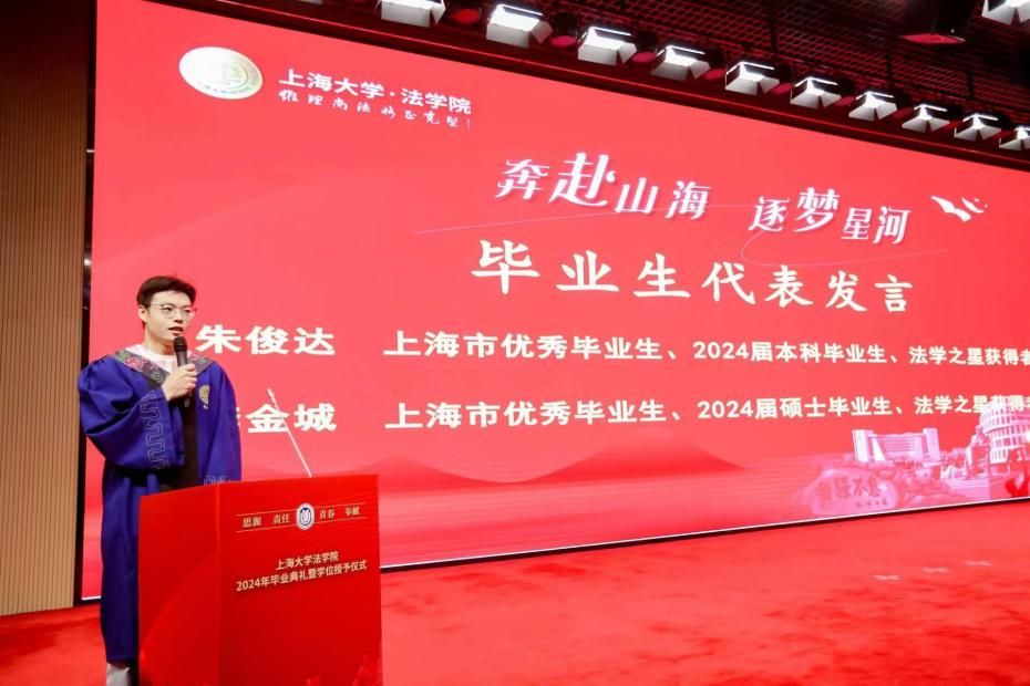 国家奖学金获得者、金沙集团1862cc成色优秀学生干部、上海市优秀毕业生、法学院学生最高荣誉“法学之星”获得者、2024年本科毕业生朱俊达同学作为本科毕业生代表发言。他分享了自己的三点感想:首先,是多用法学,本科教育带来的法学思维、理论体系及对公平正义的追求将会在职业生涯中常用常新;其次,是少用法学,在动用法律武器前应先问问心中的道德律;最后一点关乎母校, “四年四度泮溪秋,一生一世上大人”,希望同学们不忘母校师恩,常回校看看。