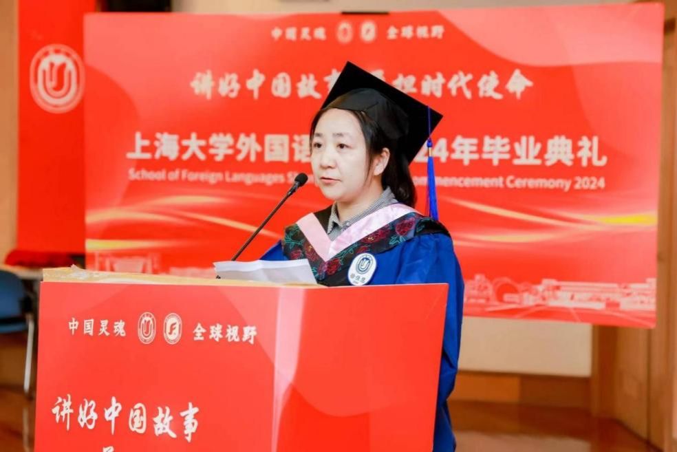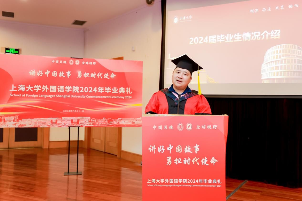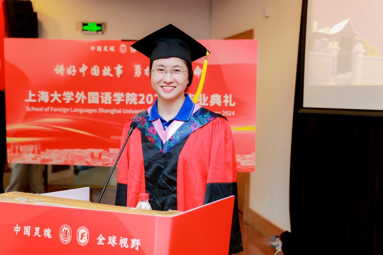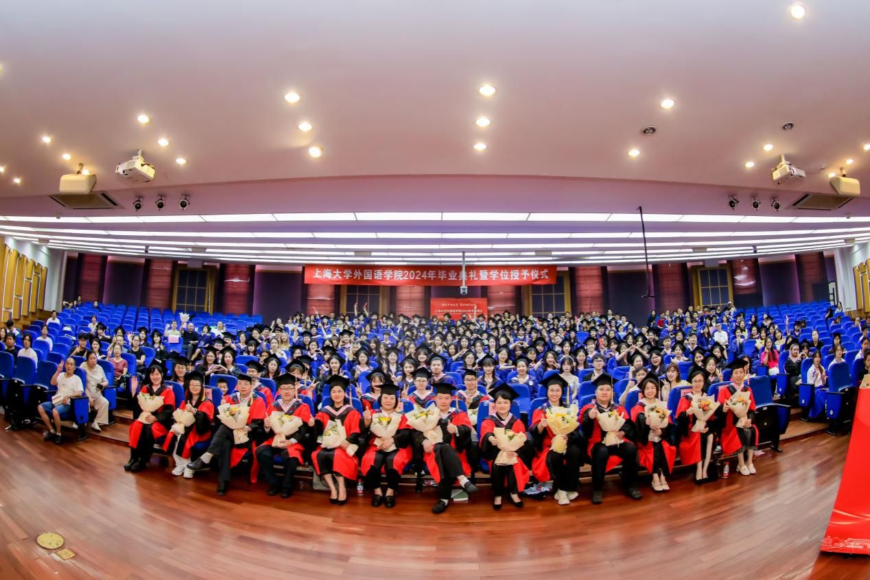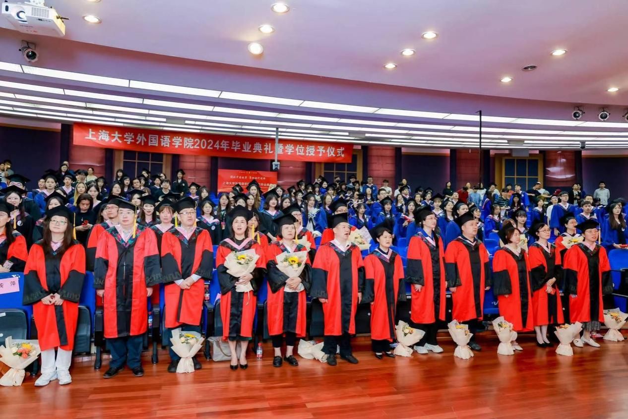 6月21日下午,金沙集团1862cc成色外国语学院2024年毕业典礼暨学位授予仪式在宝山校区J202隆重举行。外国语学院党委书记吴蔚,党委副书记、院长尚新,党委副书记、副院长贾小琴,副院长戴朝晖、唐青叶,学院工会主席黄欣,英语系主任张建琴,副主任龚萍,日语系主任赵莹波,副主任苏鹰、文雪,法语系主任王文新,大学外语部主任李晓媛、副主任于梅欣,研究生公共外语部主任马拯,MTI教育中心副主任花亮,教师代表邓志勇、竹旭峰、李夏青、张晓娜、张永娇、焦舒曼,校友代表朱依蓓以及2023届毕业生和2024届毕业生代表共同参加了本次毕业典礼。典礼由2022级法语专业本科生宁文燕和2023级日语专业本科生邓修杰主持。