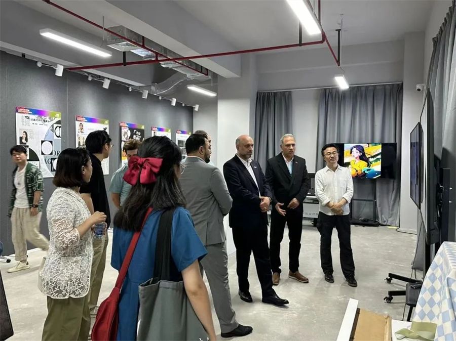 伊朗电影代表团首先来到上海电影学院新大楼参观2024毕业季展演。伊朗电影代表团成员对学生艺术创造力和专业水平给予高度评价。他们详细询问各专业作品信息、积极参与技术展示的互动并了解创作理念与技术应用。