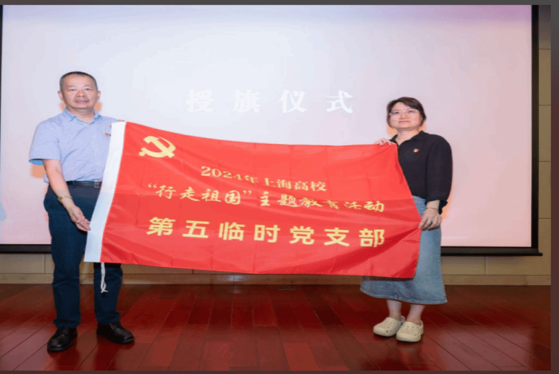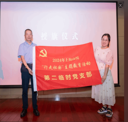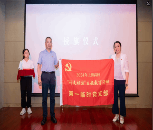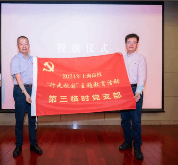 上海市学生事务中心副主任王涛为“行走”团队依次授予临时党支部旗帜。