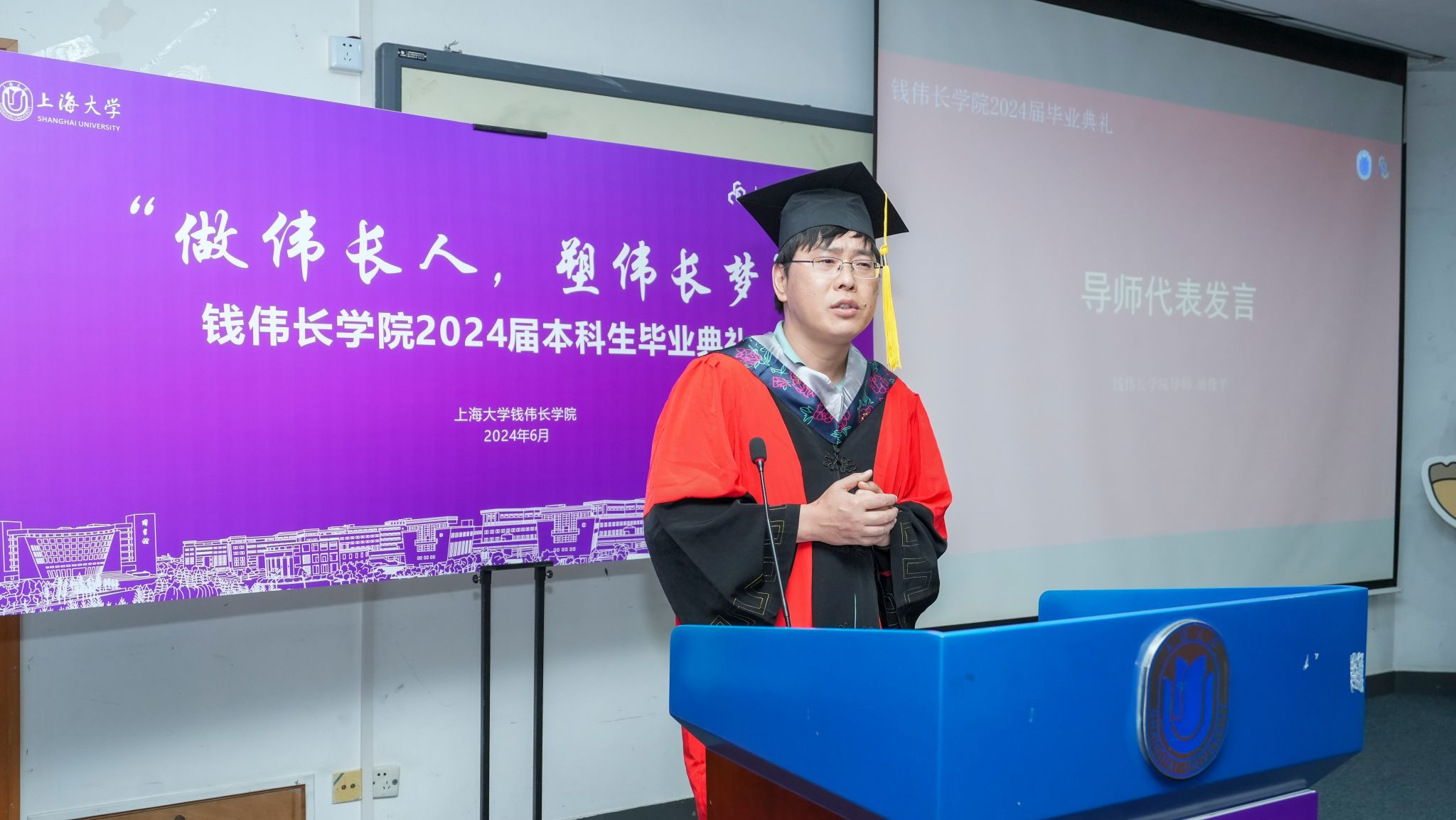钱伟长学院导师代表姚锋平老师为即将踏上新征程的毕业生们送上寄语。姚老师和同学们共同回忆了从大一的第一次上课到大四的论文答辩情景,肯定了这届同学们因为困难,所以不易,因为不易,做到如此优秀,希望同学们能把这份优秀继续贯彻到底,直到永远!