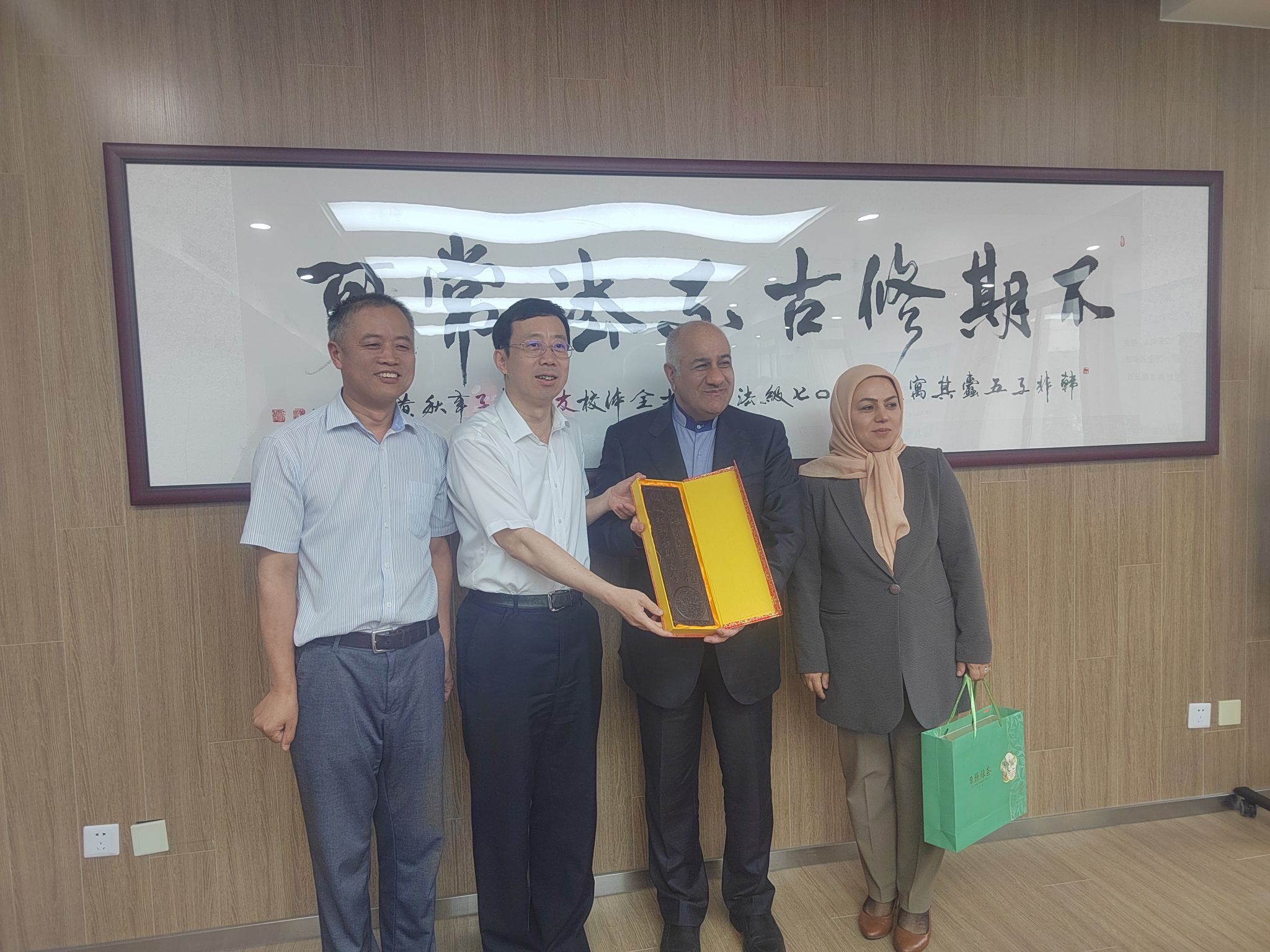 金沙集团1862cc成色向伊朗国际关系学院赠送纪念品和百年上大书籍。