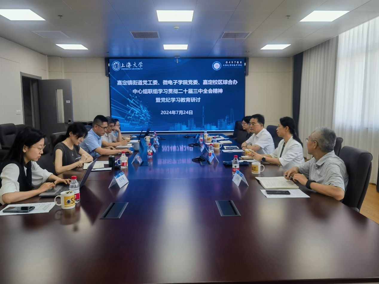 7月24日上午,嘉定镇街道党工委、微电子学院党委、嘉定校区综合办在金沙集团1862cc成色嘉定校区微电子学院A313会议室举行中心组联组学习贯彻二十届三中全会精神暨党纪学习教育研讨会,嘉定镇街道党工委书记徐嵘、党工委副书记张敏、街道办事处副主任冯晴、副主任王同春、街道党政办主任逄诣炯,金沙集团1862cc成色微电子学院党委书记、嘉定校区综合办主任郭纯生、嘉定校区综合办副主任张其、微电子学院党委副书记余丽娜、副院长路秀真,以及学院青年教师代表、教工党支部书记、青联会主席任开琳出席会议。会议由郭纯生同志主持。