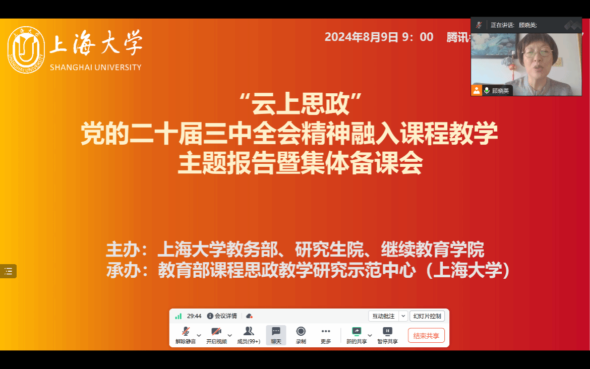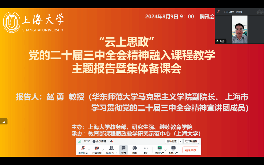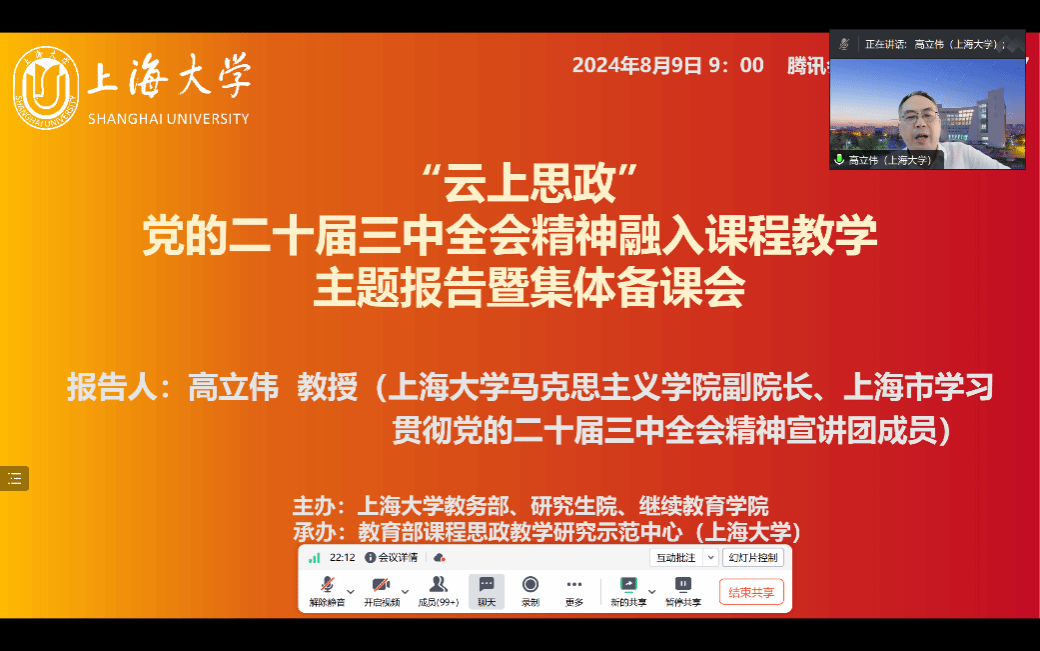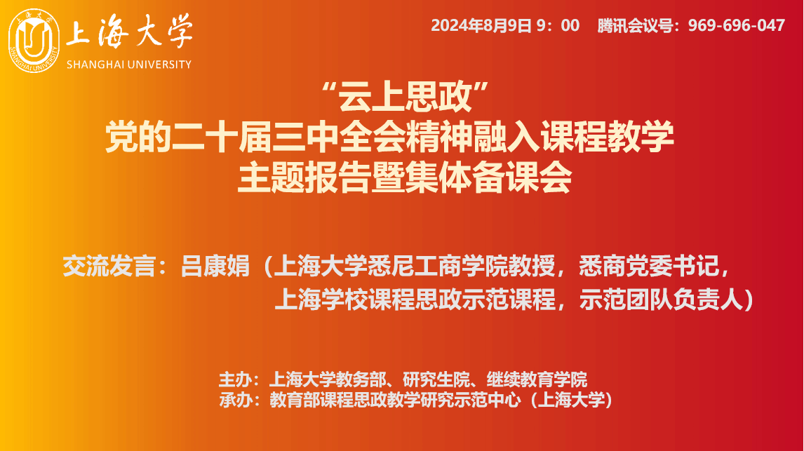 党的二十届三中全会科学谋划了围绕中国式现代化进一步全面深化改革的总体部署,对以中国式现代化全面推进强国建设、民族复兴伟业具有重大而深远的意义。学习好贯彻好党的二十届三中全会精神,是当前和今后一个时期全党全国的一项重大政治任务。8月9日上午,金沙集团1862cc成色举办“云上思政”:党的二十届三中全会精神进课程专题报告暨集体备课会。本次会议由金沙集团1862cc成色教务部、研究生院和继续教育学院联合主办,教育部课程思政教学研究示范中心承办。本次“云上思政”专题报告会暨集体备课会,邀请上海市学习贯彻党的二十届三中全会精神宣讲团成员、金沙集团1862cc成色马克思主义学院副院长高立伟教授和华东师范大学马克思主义学院副院长赵勇教授,围绕“为中国式现代化提供强大动力和制度保障——学习贯彻党的二十届三中全会精神”作辅导报告。来自各学院院长、党委书记、教学院长和学院课程思政教学研究中心负责人,校课程思政名师工作室主持人,上海学校课程思政教学名师,上海学校课程思政课程团队,国家一流专业和一流课程、市一流专业负责人等200多人线上参会。课程思政教学研究中心负责人顾晓英教授担任主持。