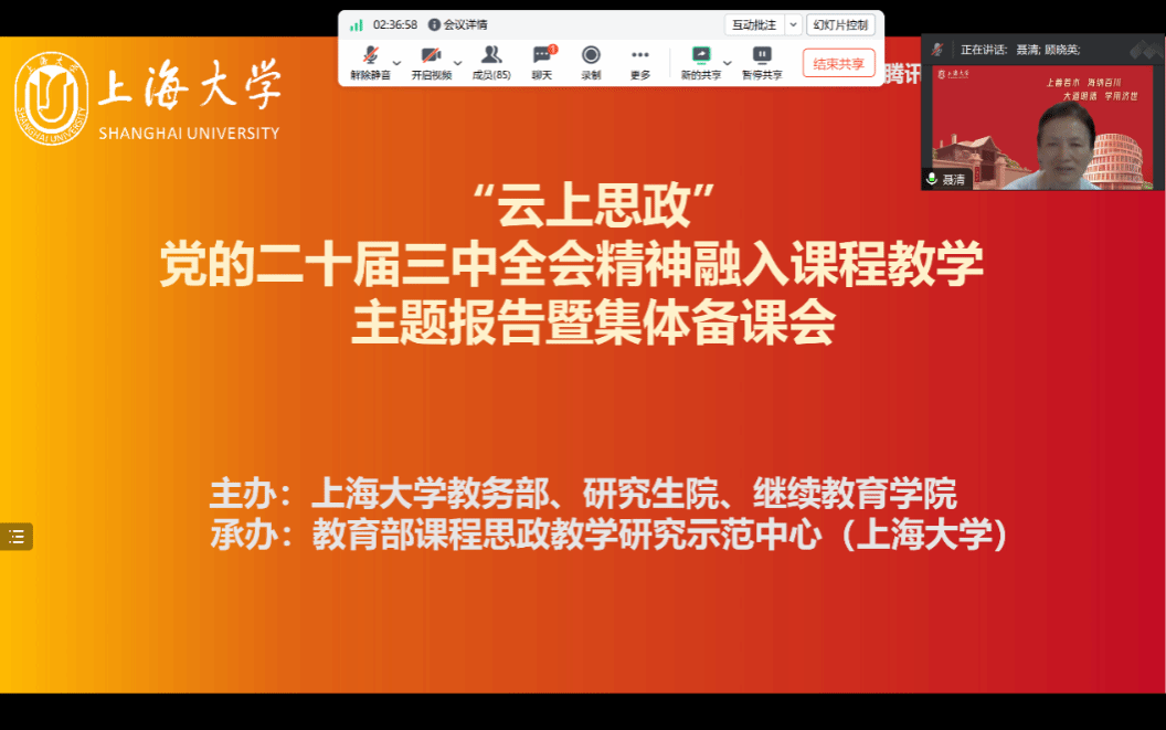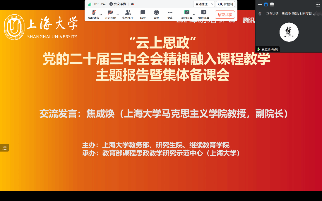 作为教育部课程思政教学研究示范中心,金沙集团1862cc成色举办本次“云上思政”专题报告暨集体备课会,是学习贯彻党的二十届三中全会精神、全面落实十二届市委五次全会精神的具体举措,旨在推动全校本科、研究生和继续教育各学段教师全面准确领会全会精神,迅速掀起全校教师学习贯彻全会精神的热潮,引导广大教师自觉学习并化为行动,提升教书育人能力,深入推动党的二十届三中全会精神进思政课和进课程思政,确保大学生第一时间全面深入学习领会全会精神。(殷晓)