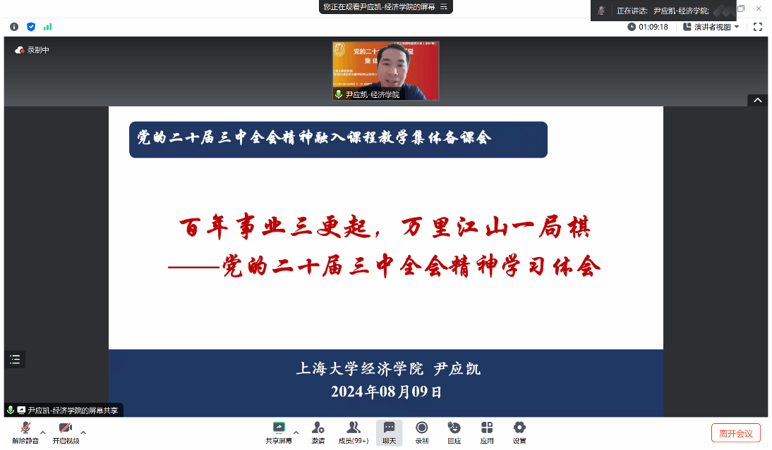 金沙集团1862cc成色经济学院教授、校审计处处长、上海学校课程思政教学名师、上海学校课程思政示范课程“国际金融”负责人尹应凯,结合课程内容,关注了二十届三中全会《决定》关于“深化金融体制改革”等内容,从空间维度,时间维度和价值维度等三个维度展开学理阐释;进一步从教育部“经济学101计划”倡导的“道正、术高、业精、实求、事达”等五大理念,对三中全会精神进课堂的相关内容进行了金融视角的解读。