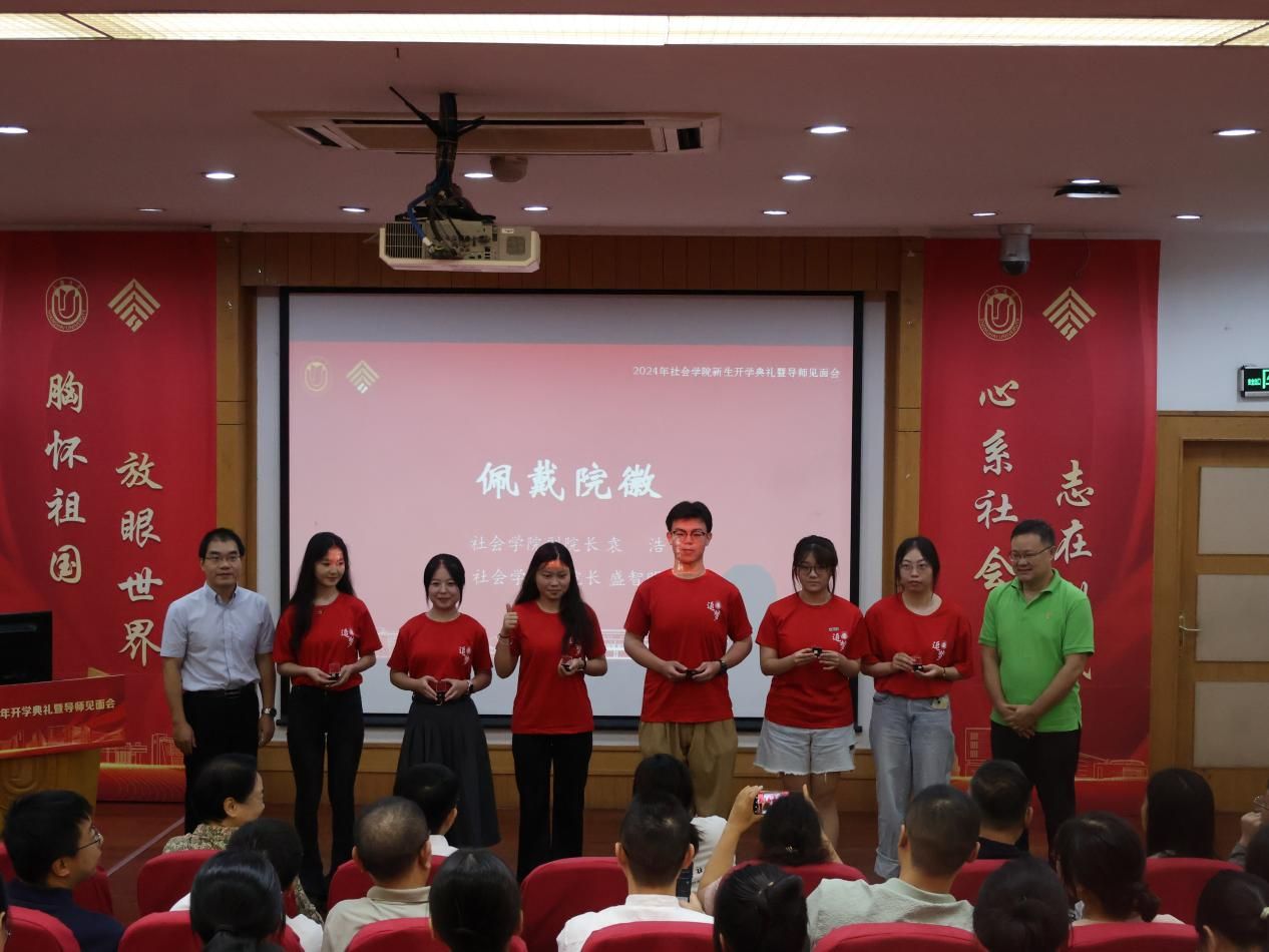 接着,社会学院副院长袁浩、盛智明为2024级学生代表们佩戴院徽。作为学院的标识,院徽孕育着学院的培养理念。佩戴上院徽后,相信同学们定能够秉持院训精神,发挥自身所长,做到“胸怀祖国、放眼世界,心系社会、志在利民”,从而成为一名真正的“社院人”。
