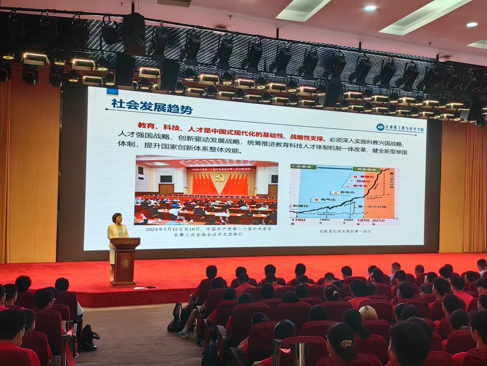 学院党委副书记、院长谢少荣带来主题为《激扬青春,智驭未来》开学第一课。院长从社会发展趋势、学院概况、主要科学研究、学院“1024”人才培养举措等方面出发,详细介绍了计算机学院的历史沿革、发展成就及人才培养成果。