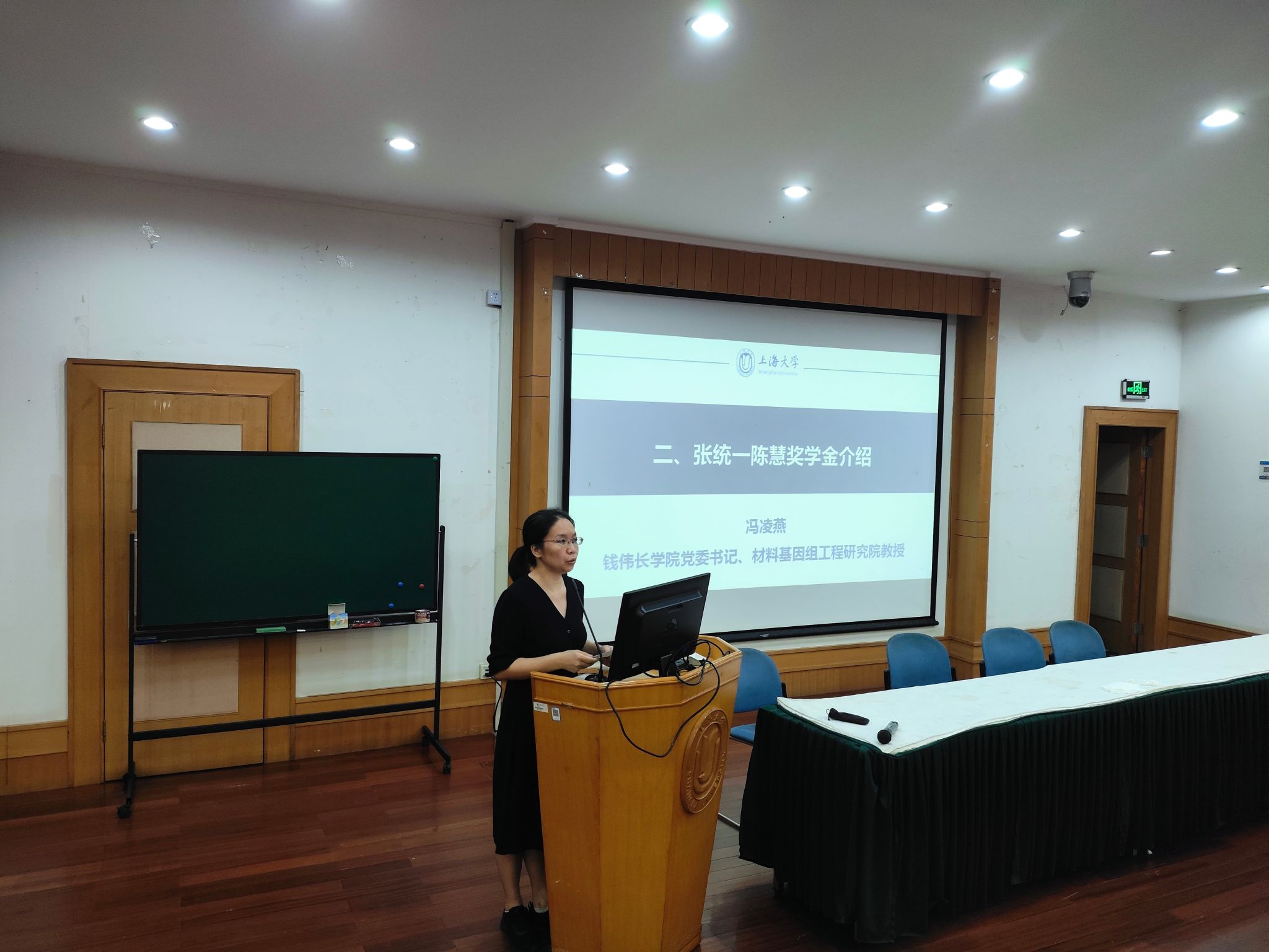 随后,冯凌燕书记向新生介绍了“张统一陈慧奖学金”的设立情况,本项奖学金是以张统一院士与其夫人姓名命名,为鼓励与支持上大学子投身AI for Materials研究而设。并介绍了往届“张统一陈慧奖学金”获得者在钱伟长学院与材料基因组工程研究院联合培养模式下的学习经历与成长心得,鼓励新生们向榜样看齐。