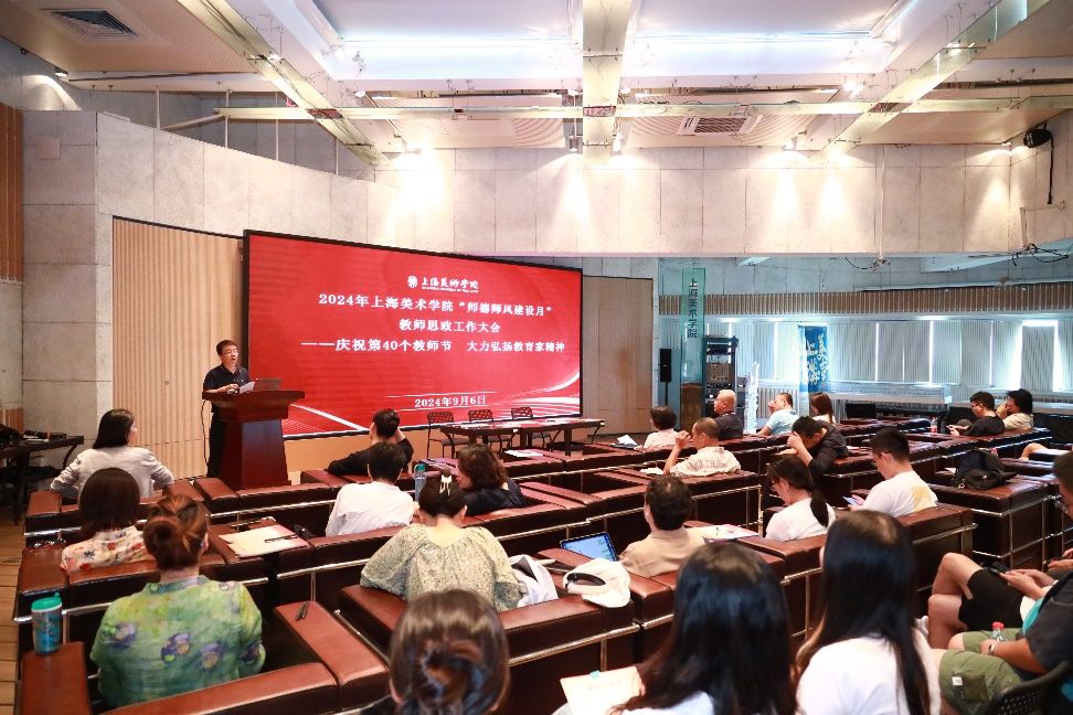 为深入学习贯彻党的二十大和二十届二中、三中全会精神,在迎接第40个教师节之际,金沙集团1862cc成色上海美术学院以“大力弘扬教育家精神,加快建设教育强国”为主题,于9月6日上午开展2024年“师德师风建设月”活动暨教师思政工作会议。会议由学院党委副书记、纪委书记宋国栓主持,学院党政班子成员、各系部教师代表、新老教师结对代表等共计60余人参加。