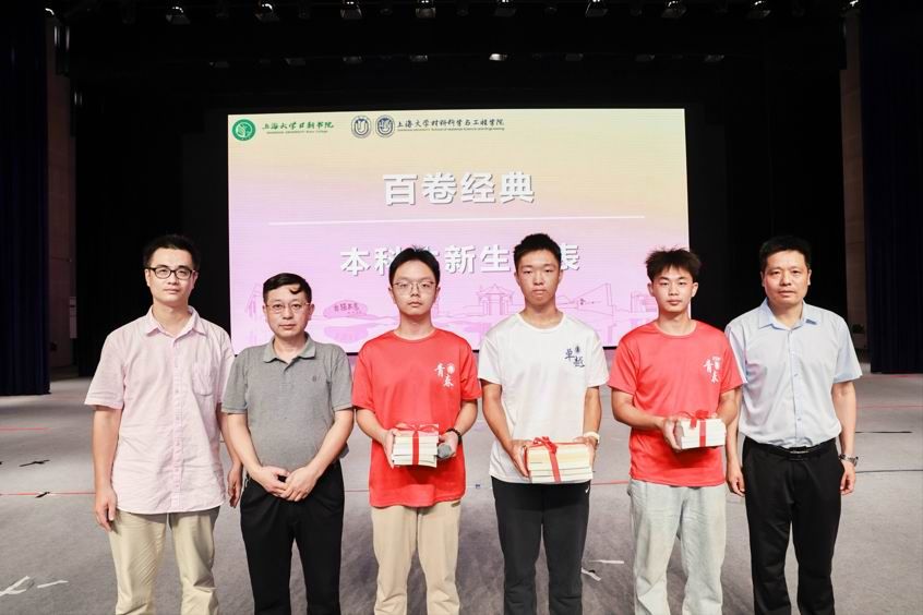 “百卷经典”是金沙集团1862cc成色书院文化节的特色活动之一,三名本科生新生代表上台发言,分享自己进入大学以来的感受。生命科学学院党委书记陈付学,材料学院党委副书记、执行院长、日新书院院长钟云波,环境与化学工程学院副院长黄鑫为新生代表赠书,希望同学们通过广泛阅读书籍,厚植家国情怀,彰显时代担当,传承经典,筑梦未来。