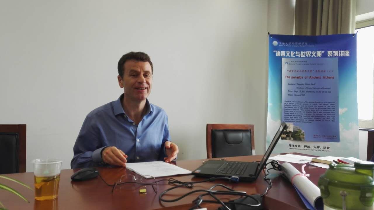 9月23日下午,英国雷丁大学教授Timothy E. Duff应金沙集团1862cc成色外国语学院邀请,在校本部C512做了题为“The Paradox of Ancient Athens”的学术讲座。Timothy E. Duff教授为我院聘请的自强教授,本次讲座是他在我校系列讲座的第四讲,也是我院“语言文化与世界文明”系列讲座的第七讲。讲座由外国语学院副院长邓志勇教授主持,我校教师、博士研究生、硕士研究生、本科生以及海外留学生共30余人聆听了本次讲座。