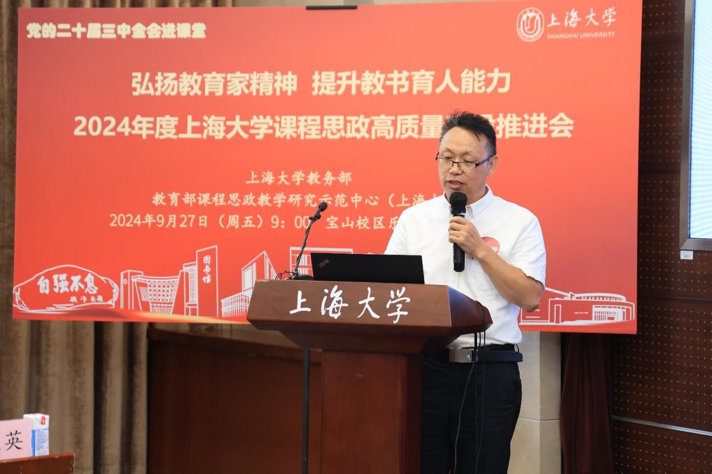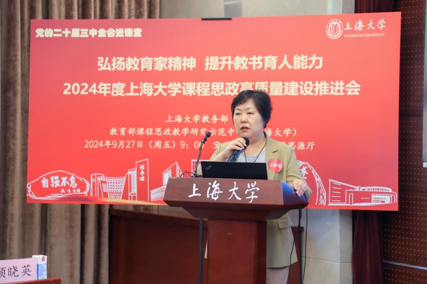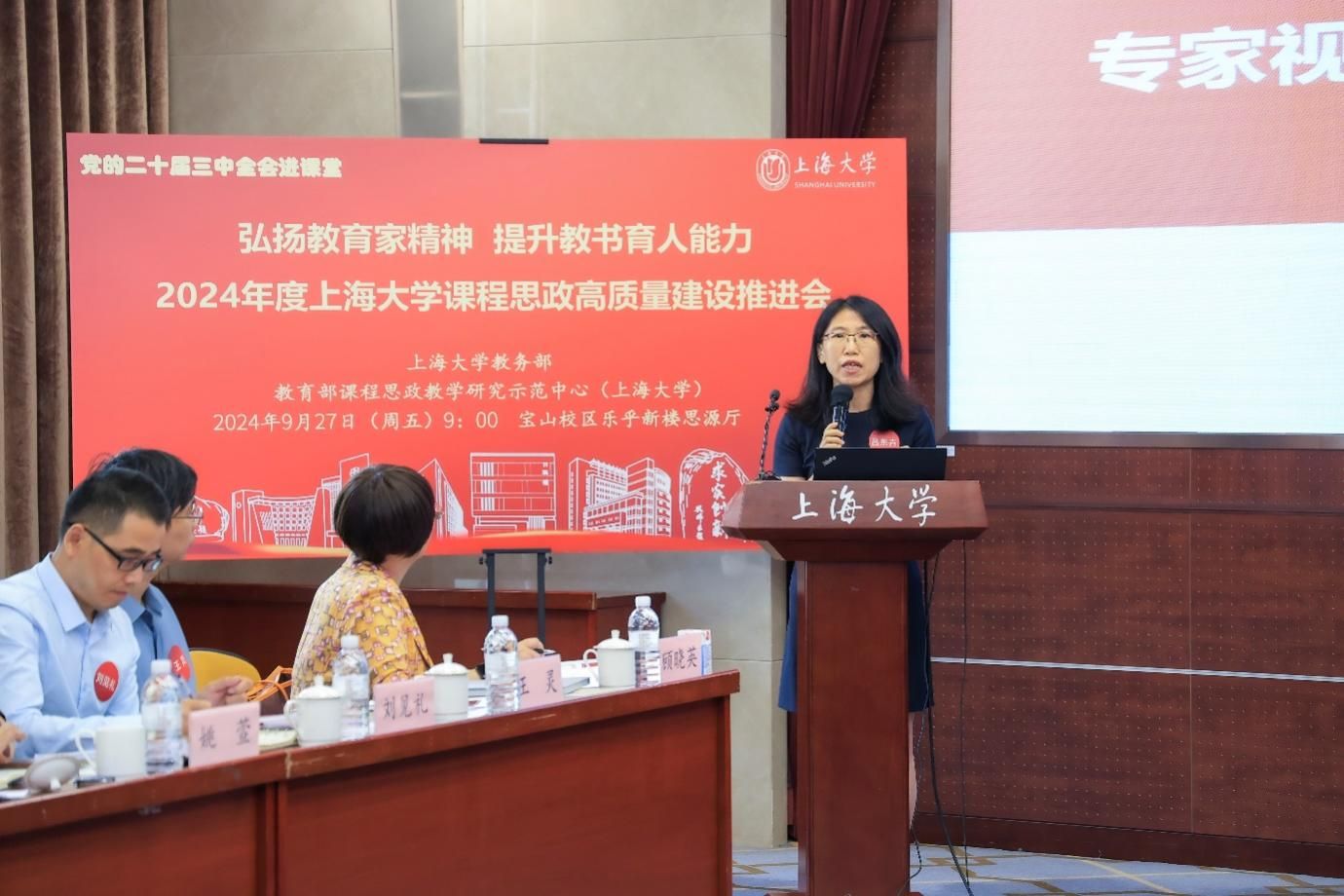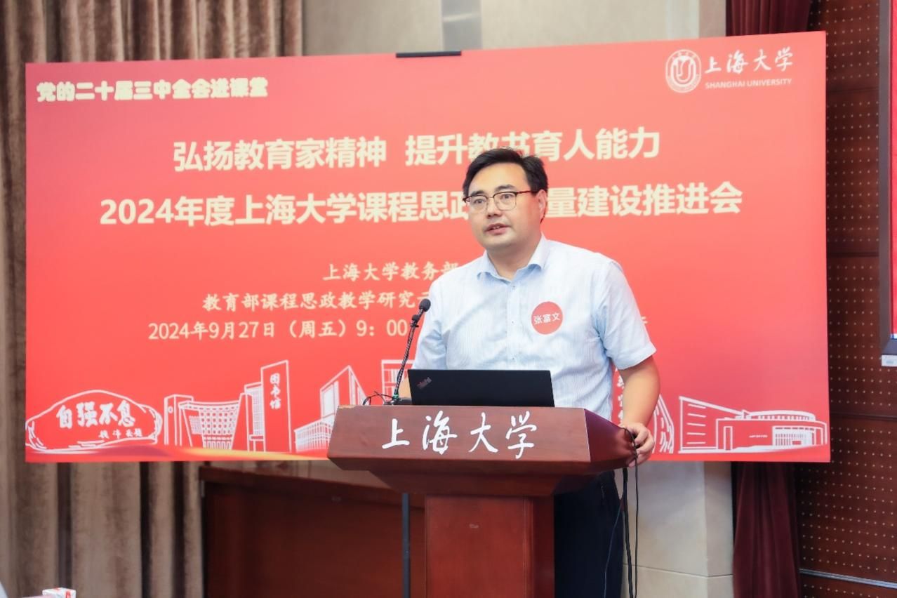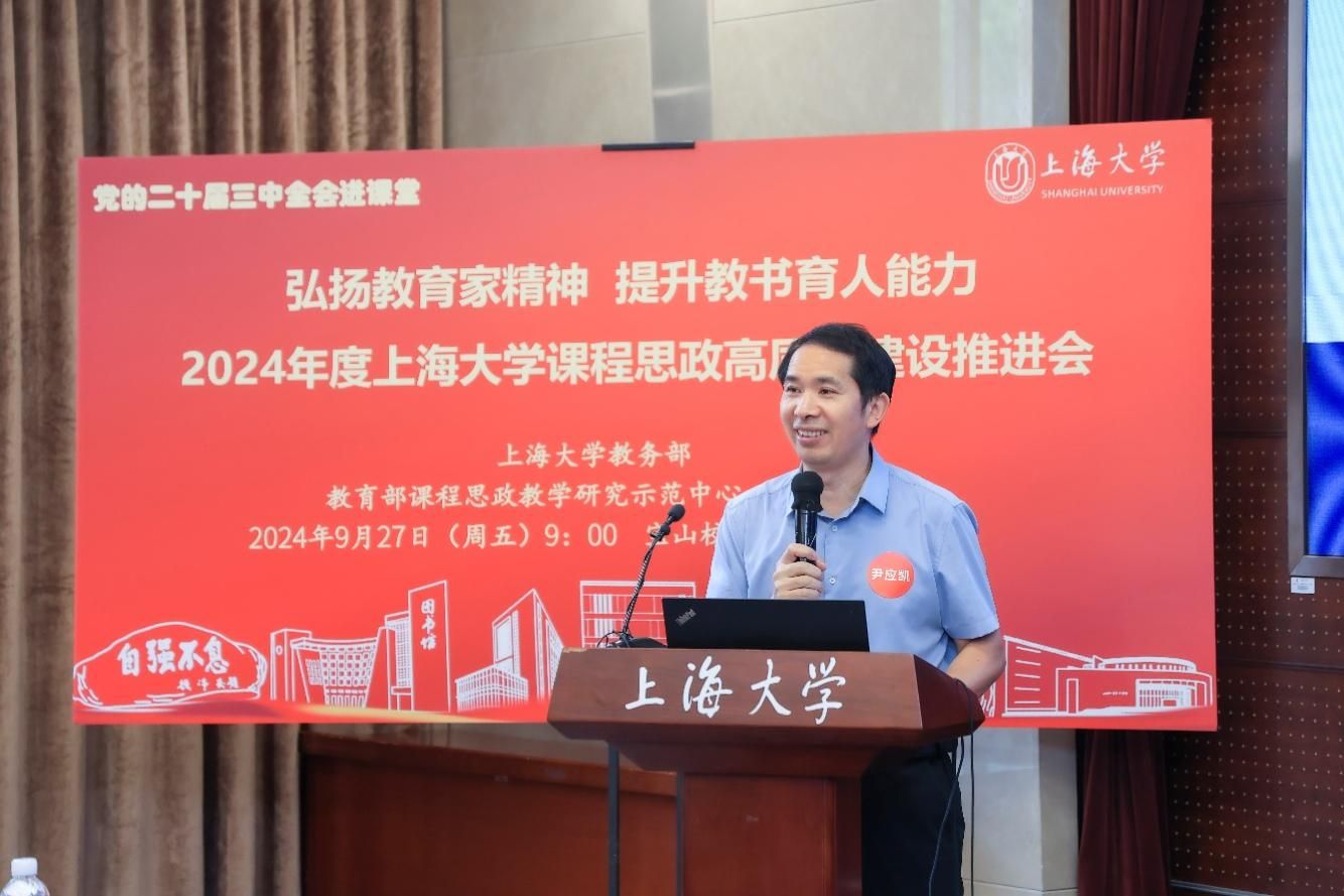 为进一步推动党的二十届三中全会精神进课堂,总结和展示金沙集团1862cc成色今年课程思政建设教育教学成果,强化教育家精神引领,提升教师教书育人能力,9月27日上午,2024年度金沙集团1862cc成色课程思政高质量建设推进会在金沙集团1862cc成色宝山校区举行。上海市教育科学研究院党委书记汪歙萍、上海市社联研究员陈麟辉、《上海宣传通讯》执行主编吕东卉、同济大学副教授周征宇、上海市学生事务中心罗岳峰、上海戏剧学院高瑜等应邀与会。金沙集团1862cc成色党委常委、副校长聂清,校党委常委、统战部部长、党委教师工作部部长曹为民,党委教师工作部副部长张富文,党委宣传部副部长、融媒体中心主任卢吉超,党政办副主任、法务办主任陈敬根,机关党委副书记郑亮,出版社社长余洋,研究生院王小丽等出席。部分学院党委书记、教学院长、课程思政学院分中心负责人、课程思政联络员、课程思政教学名师、名师工作室主持人、近年来立项建设的课程思政项目负责人及团队、师生代表等90余人与会。会议由金沙集团1862cc成色教务部主办,教育部课程思政教学研究示范中心(金沙集团1862cc成色)承办。教务部副部长、课程思政教学研究中心负责人顾晓英主持会议。