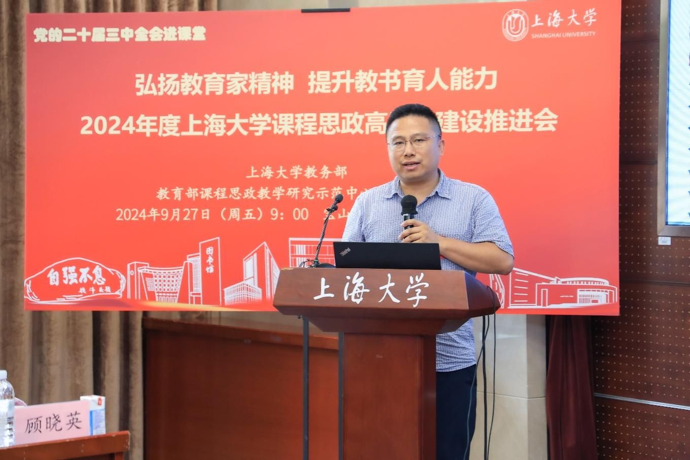 顾晓英首先欢迎并介绍与会嘉宾。她指出学校从2014年首开“大国方略”以来,课程思政建设一路耕耘不停歇,接续获评国家级、市级教学成果、示范课程和各类比赛奖等。成绩的取得离不开校外内专家指导支持,学校领导、各部门统筹发力,尤其是广大教师的持续付出和努力。党的二十届三中全会《决定》提出:“提升教师教书育人能力”,全国教育大会强调弘扬教育家精神,本年度课程思政高质量建设推进会就是在这样的背景下召开。会议旨在通过表彰课程思政优秀典型,展示教师教书育人风范,突出课程思政教育教学改革立足教师、着眼课程,进一步推进立德树人课程育人高质量建设。