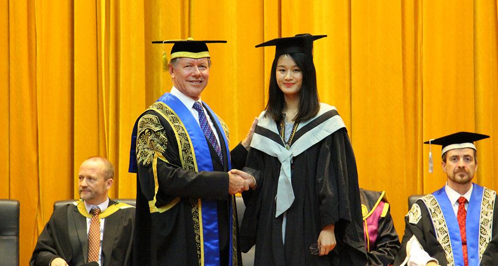 随后,悉尼科技大学代理名誉校长Brian Wilson站在主席台中央,态度和蔼,面带微笑,依次与秩序井然、鱼贯上台的学位获得者亲切握手并合影留念。