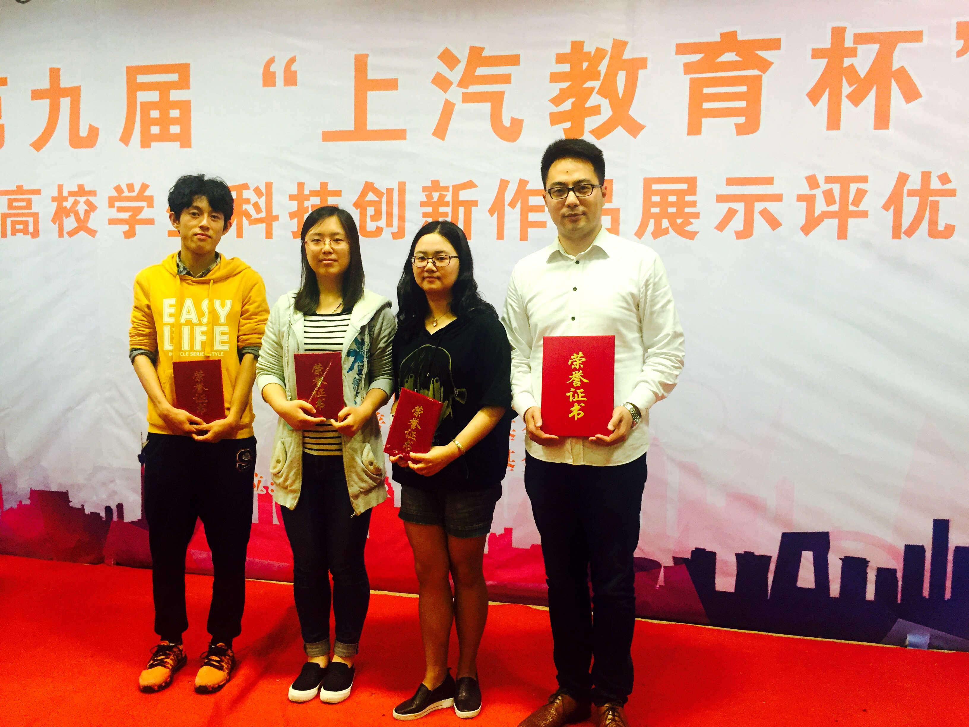 2016年5月13日下午,第九届“上汽教育杯”上海市高校学生科技创新作品展示评优活动终评及表彰大会在东华大学延安路校区第三教学楼四楼会议厅举行,我校师生代表出席并获奖。