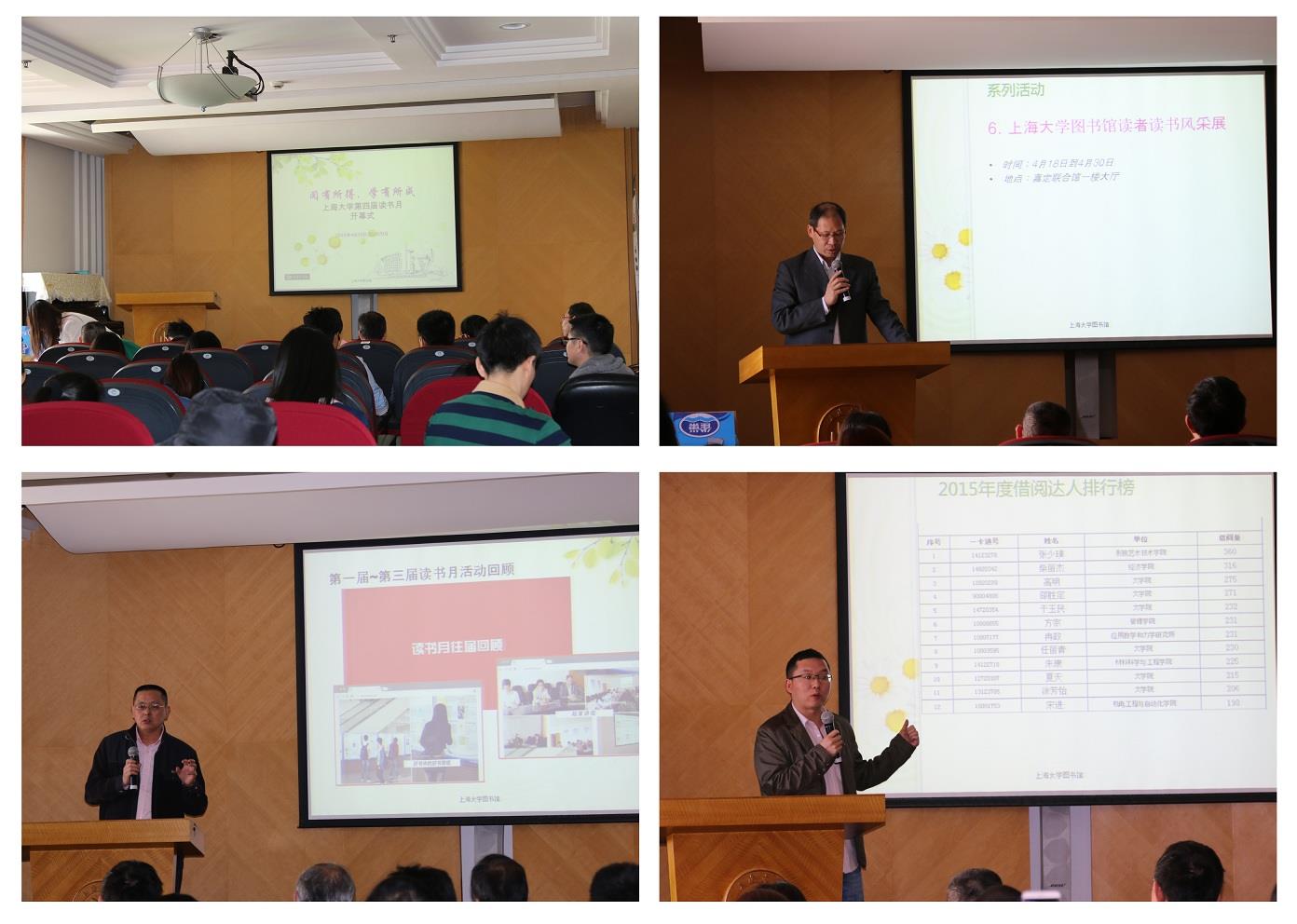 开幕式在《金沙集团1862cc成色读书月活动巡礼》微视频中拉开帷幕,随后校文明办主任、宣传部副部长刘绍学为本次读书月活动致开幕辞,认为图书馆是书香之地,具有浓浓的阅读氛围,读书月活动与现代大学的四大功能密切关联,希望广大学子阅读经典,学有所成。社区学院副院长何幼桦分享了社区学院读书会活动的经验。图书馆常务副馆长陆铭结合“4.23世界读书日”人文背景,号召大家积极参与读书月活动,支持图书馆建设与发展,并对本次读书月活动安排进行了介绍。文学院党委副书记崔海霞宣读了“2015年金沙集团1862cc成色图书借阅排行榜”,老年大学副校长姜继平宣读了“2015年金沙集团1862cc成色图书馆借阅达人排行榜”,借阅达人代表、文学院博士高明同学与大家分享了自己的阅读心得,并号召大家积极利用图书馆资源宝库,丰富自身的学习人生。