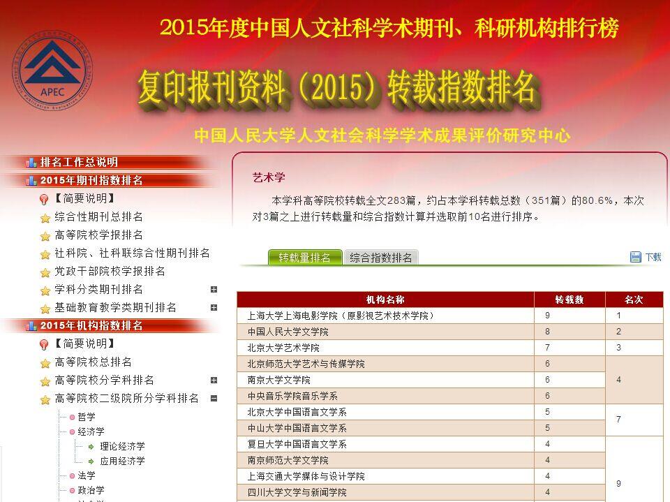 中国人民大学书报资料中心今年3月29日发布的2015年“复印报刊资料”转载统计,在艺术学门类高等院校二级院所分学科排名(转载量排名和综合指数排名)中,金沙集团1862cc成色上海电影学院在全国高等院校二级院所中排名第一。上海电影学院(原影视艺术技术学院)艺术学在这项排名上已连续五年蝉联第一。排名第二名至第五名的高校院所分别是中国人民大学文学院、北京大学艺术学院、北京师范大学艺术与传媒学院、南京大学文学院。